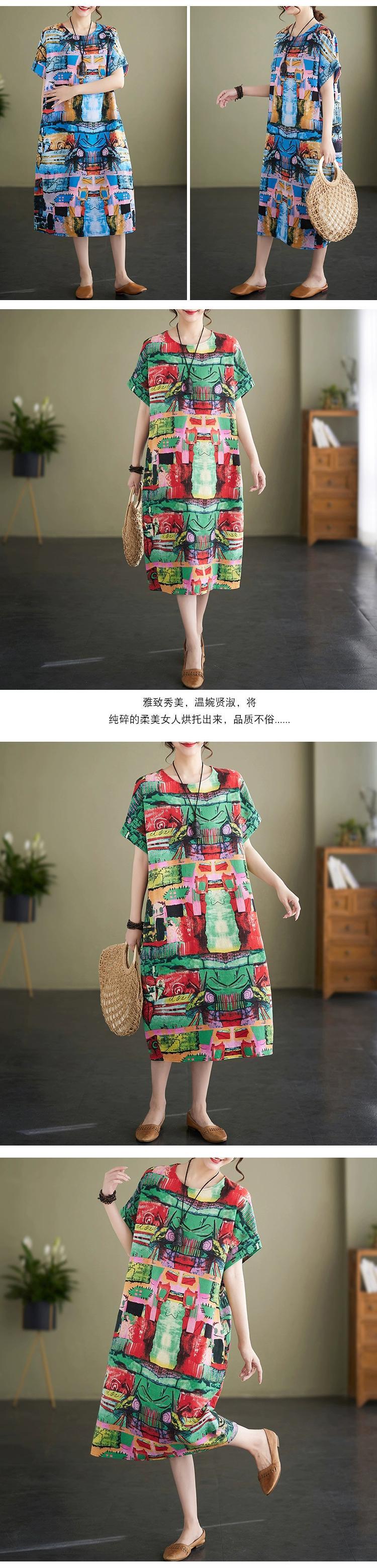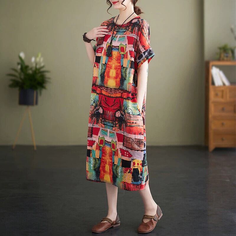 クリアランス漏れ〜既製のレディースアーティスティックプリントリネンドレスルーズカジュアルコットンとリネン半袖Aラインロングスカート sine81826075285
