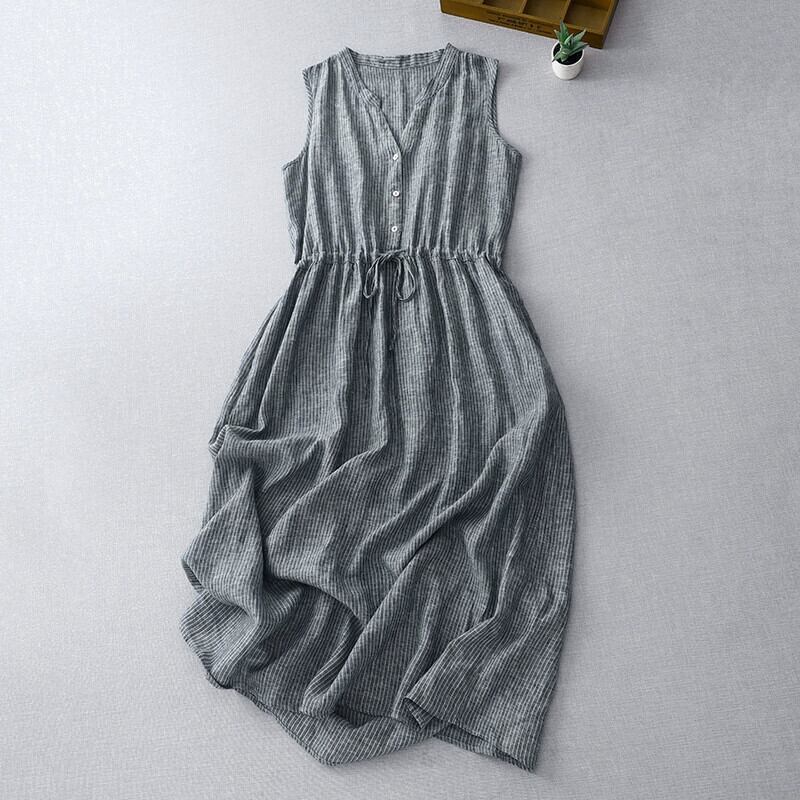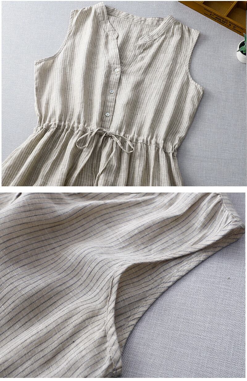 クリアランスリーク〜eseオリジナルレディースストライプコットンリネンベストドレスウエストタイ付きVネックリネンノースリーブドレス sine87179455865