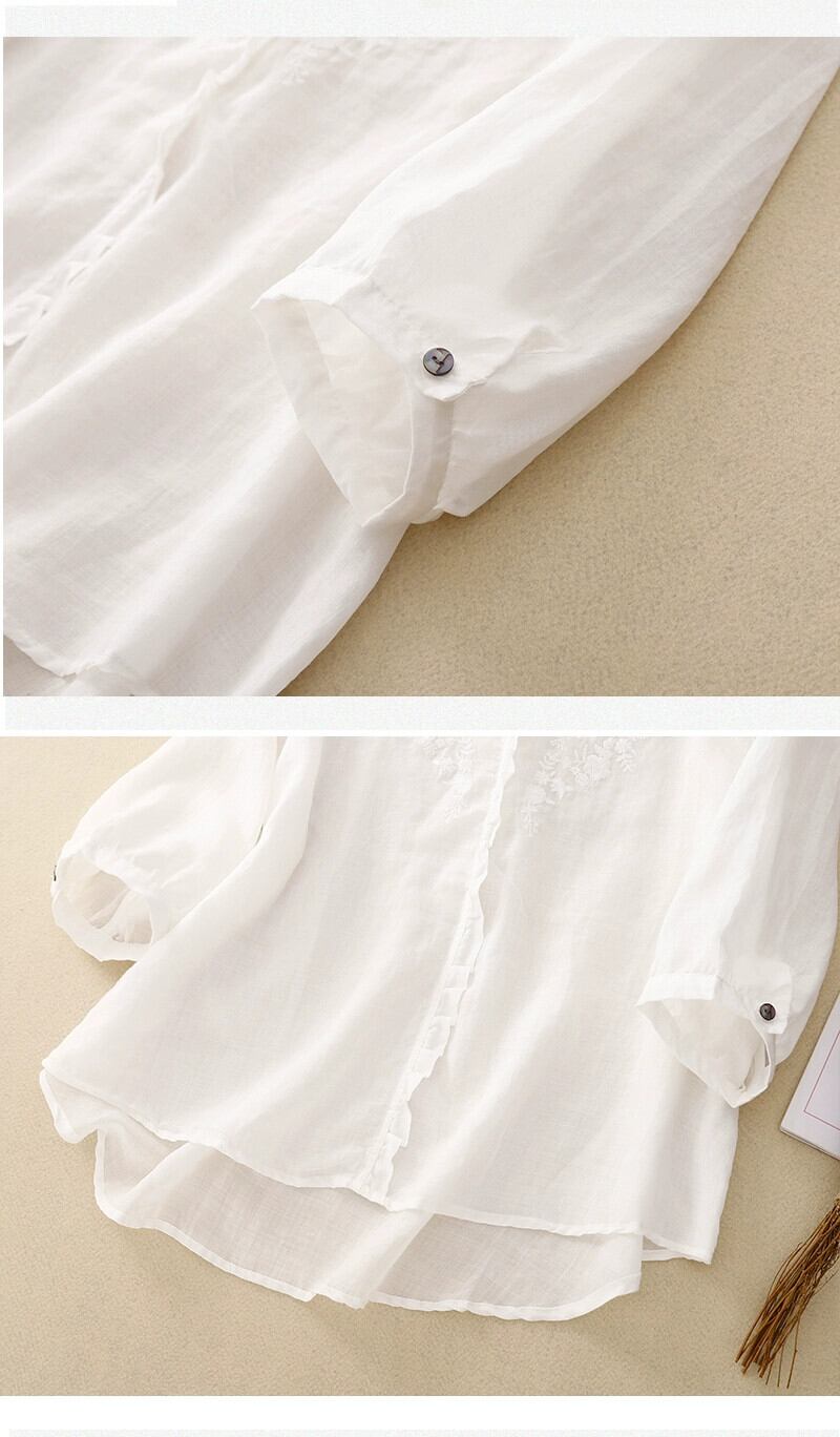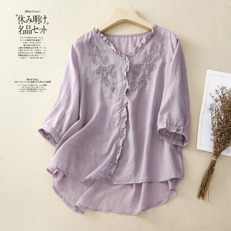 クリアランスカウンター最後の在庫レディース刺繍レースコットンとリネンシャツルーズVネックリネン七分袖トップ レッド sine27949775940