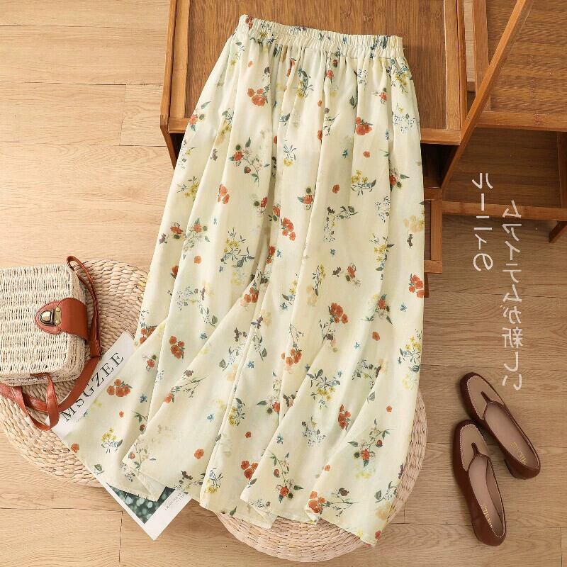 ディスカウントストアショッピングモール文学花綿とリネンスカート女性のウエスト巾着二重層ラミー A ラインスカート コットン 花柄 Aライン sine60674863738