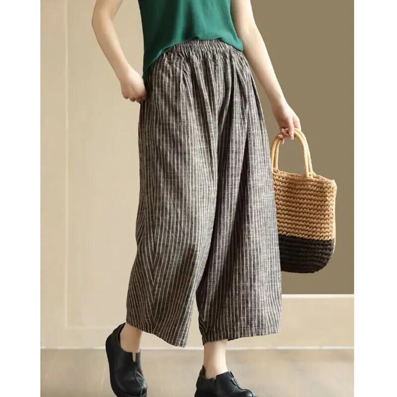 Eign Trade 割引ブランドテールグッズレトロストライプコットンとリネンワイドレッグパンツレディース、ルーズハイウエストリネンカジュアル9点パンツ sine79431027349