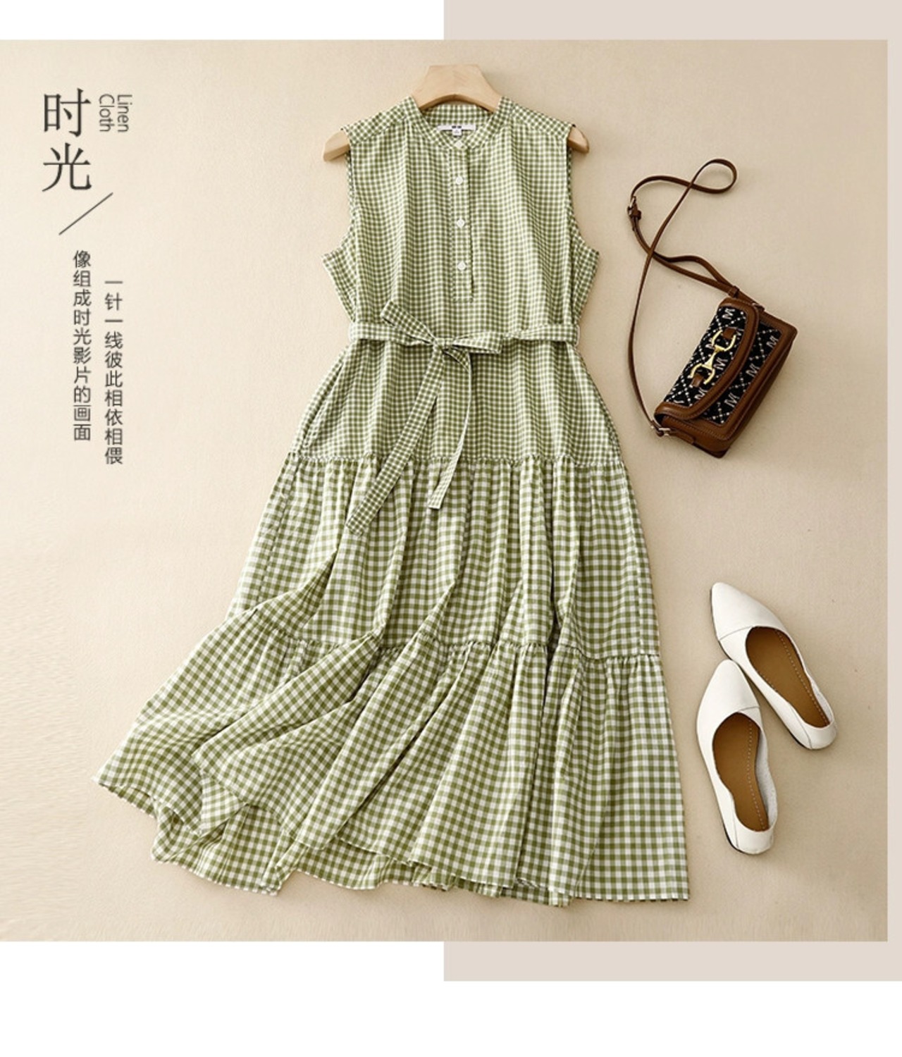 eign trade 高級ブランド割引 ese リネンチェック柄ベストドレス女性のルーズウエストベルト付き綿とリネンのロングスカート コットン ハーネス sine48783033316