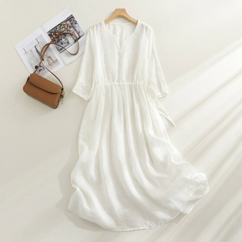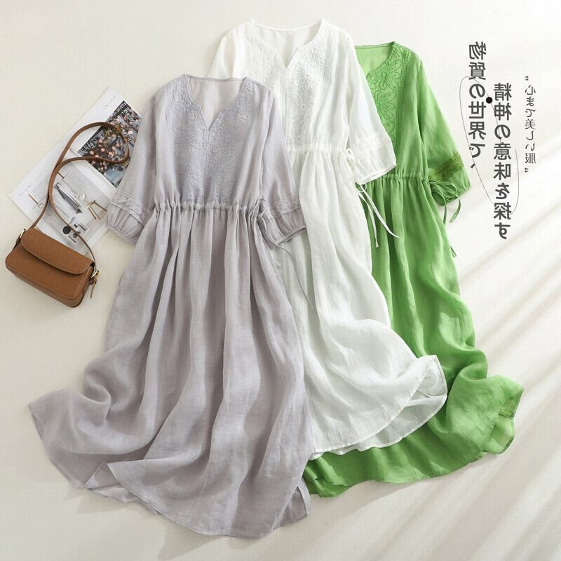 eign trade ese スタイルオリジナルオーダービッグブランド撤退女性エストスタイル刺繍ラミードレスウエストタイ V ネックリネンロングスカート レッド Vネック sine95928269553