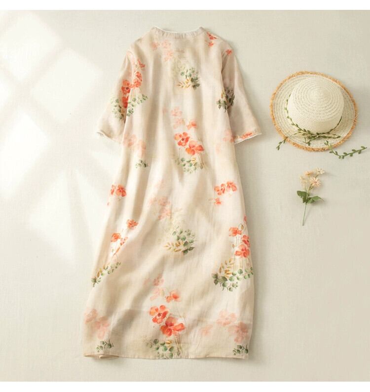 クリアランスカウンター最後の在庫女性の中国風スラントラペルコットンとリネンのチャイナドレスプリントリネンスタンドカラードレス sine52686193337