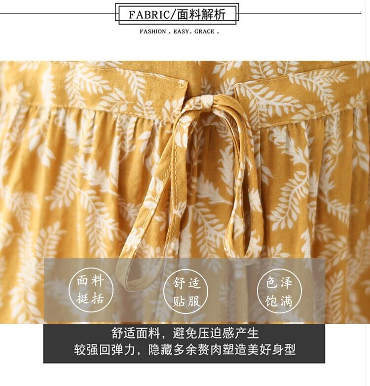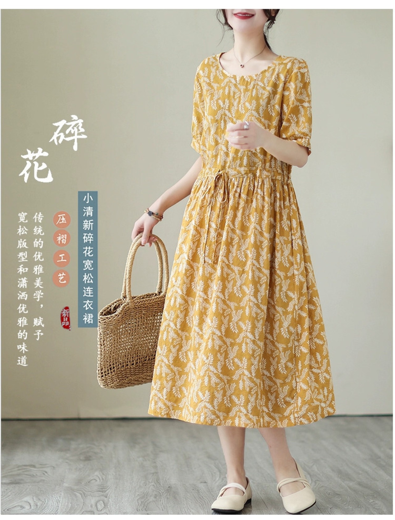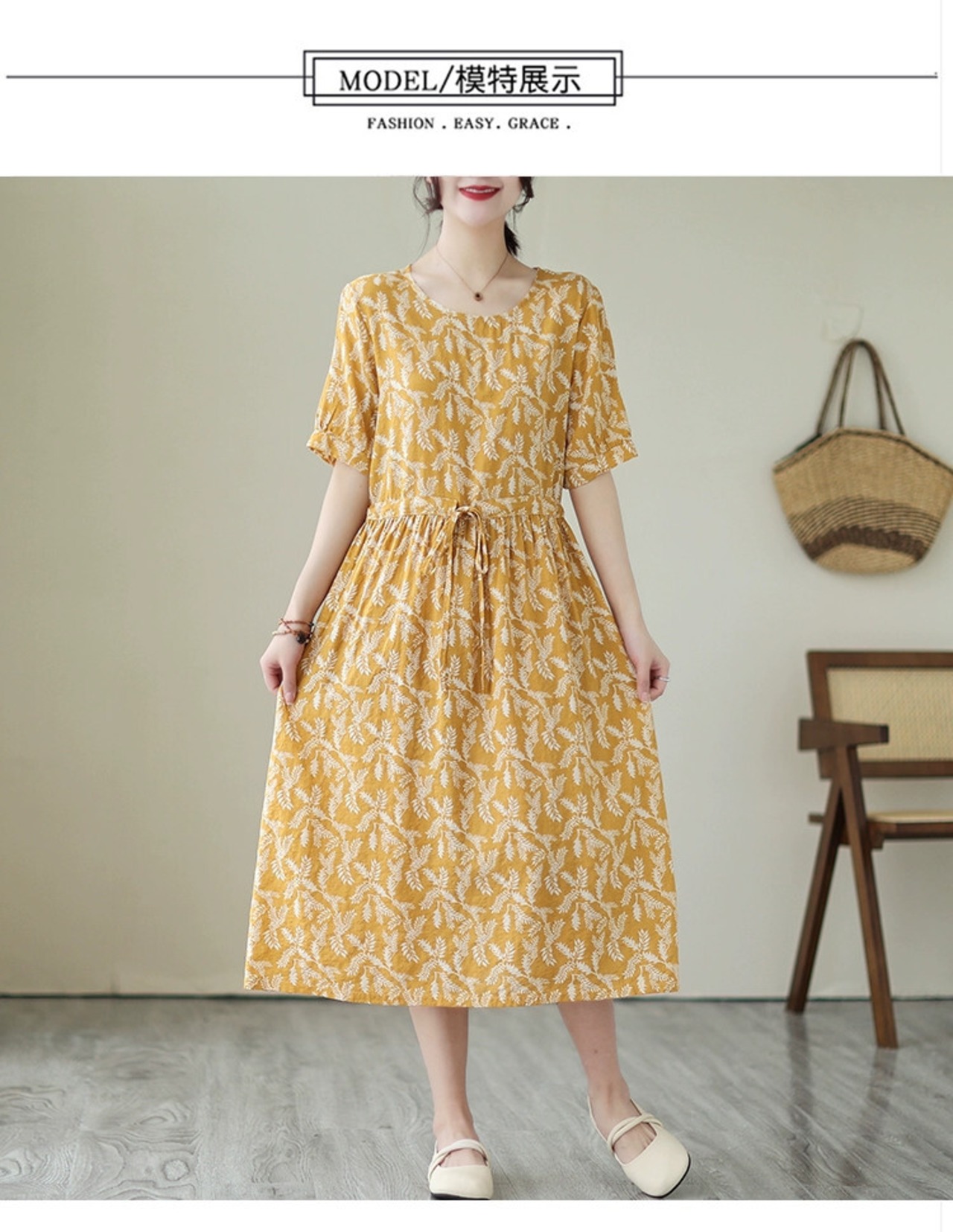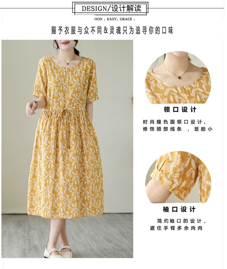 eign trade ese オリジナルの有名な既製のコットンとリネンの花柄ドレス女性のルーズウエストリネン半袖 A ラインロングスカート Aライン sine5173139451