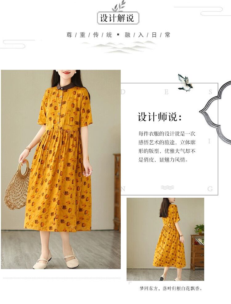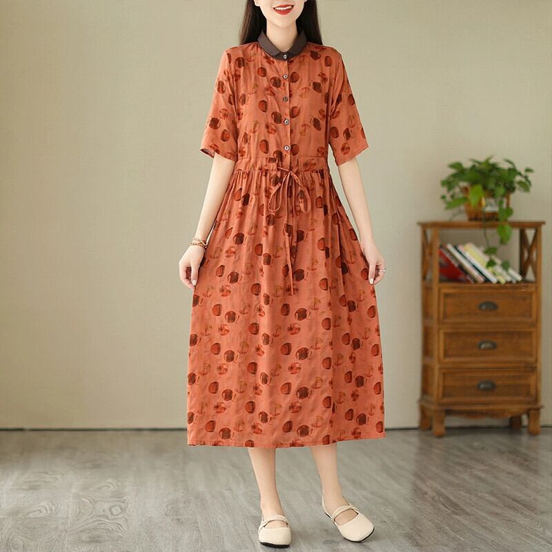 eign trade ese オリジナルの有名な既製のコットンとリネンのプリント半袖シャツドレス ルーズ レースアップ リネン A ライン ドレス Aライン sine3175539091