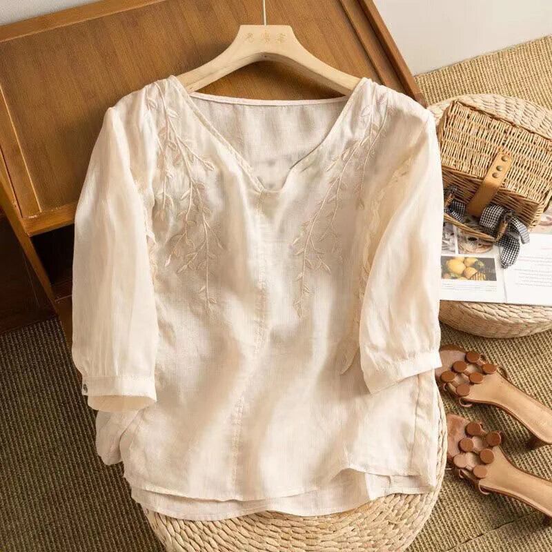 eign trade 割引ブランドテールグッズレトロ刺繍ラミーシャツトップルーズでライトリネン半袖シャツ女性 レッド sine59131203530