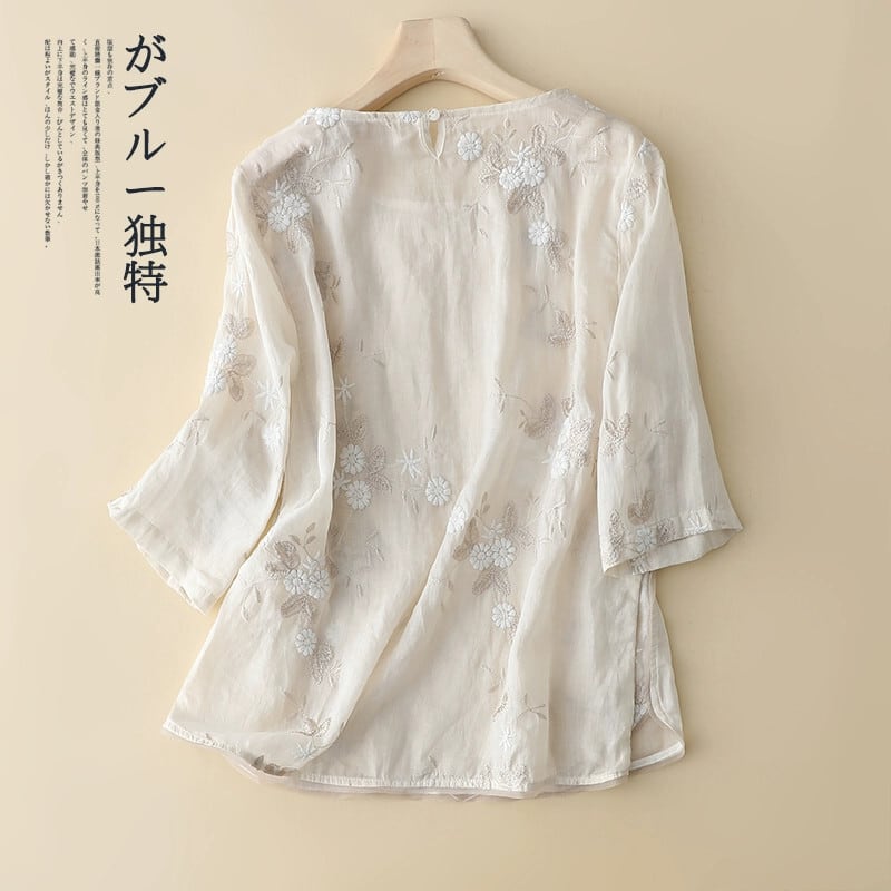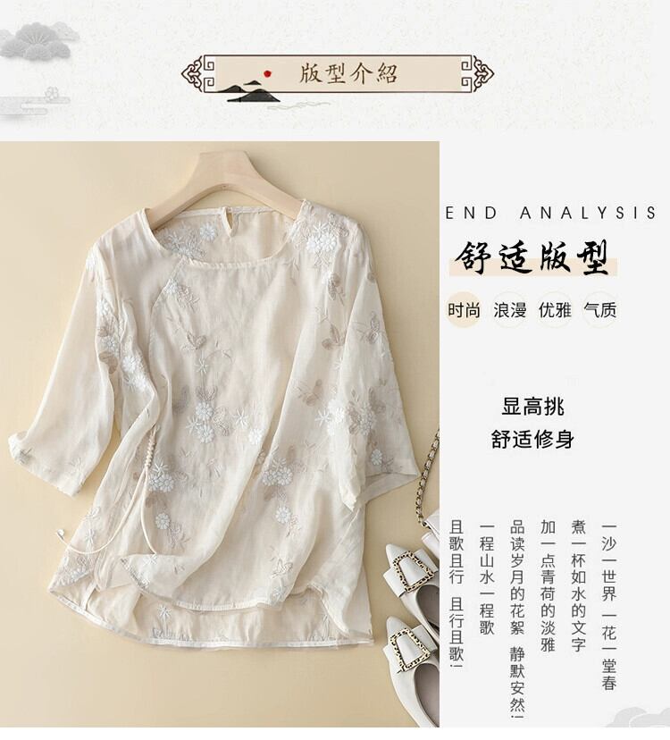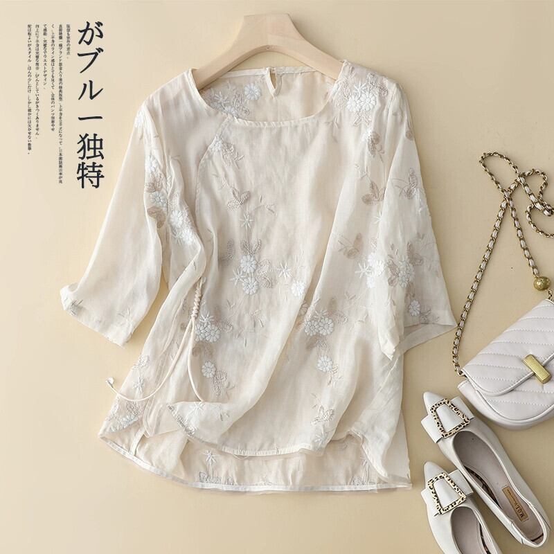 永貿易輸出ビッグブランドテール商品撤退レトロ刺繍綿とリネンシャツ女性の緩くて軽いオーガンジーリネントップ レッド コットン sine34325820646