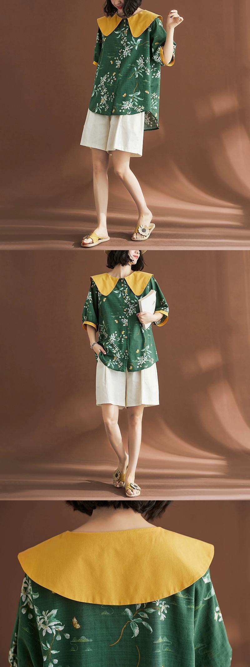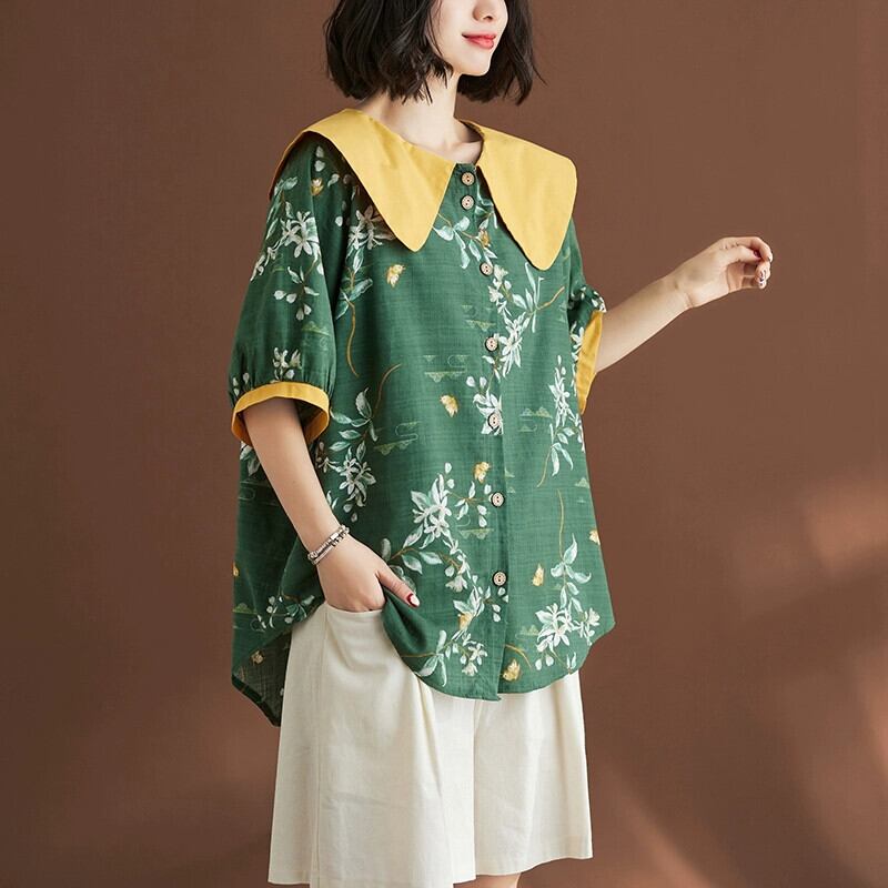 有名人の在庫切れ文学コットンとリネンのドールカラーシャツレディースレトロプリントリネン半袖トップスのクリアランスカウンターの削除 sine97522049809