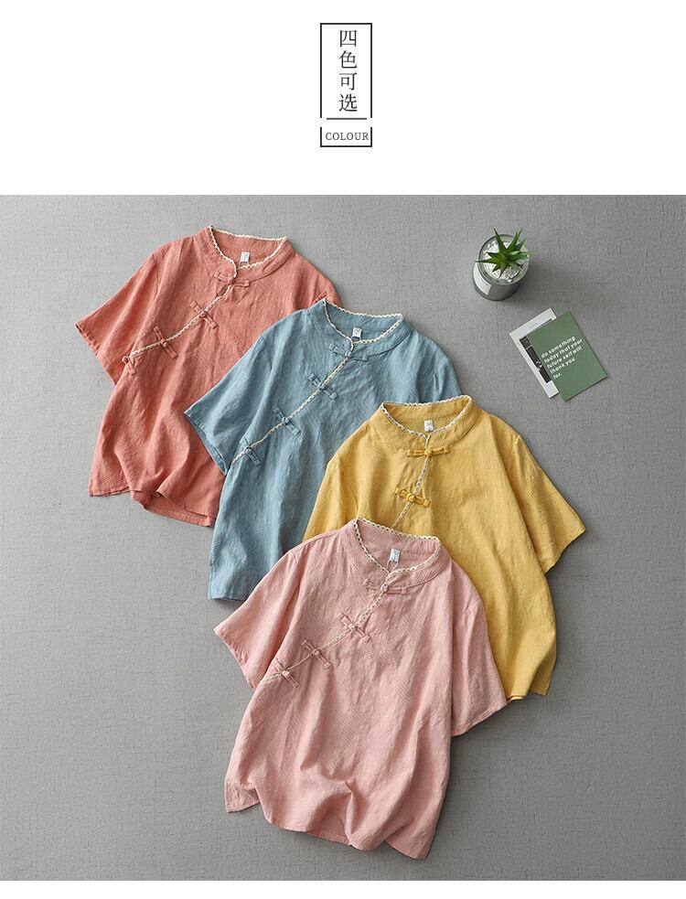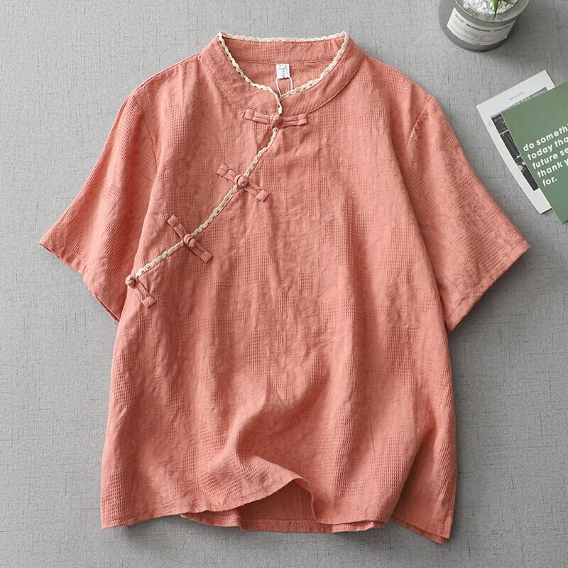 ディスカウント ストア ショッピング モールの女性の中国風の斜めボタン付きラミー トップ ルーズ ジャカード リネン半袖シャツ sine36112377795