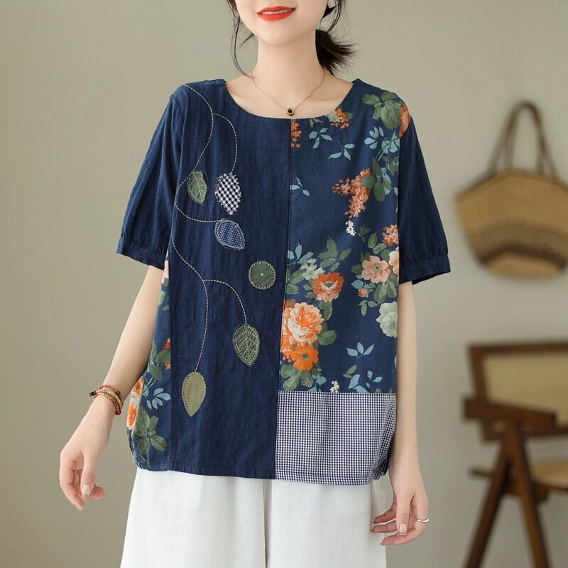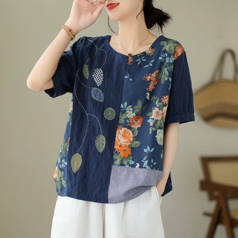 永貿易輸出ビッグブランドテール商品撤退女性のレトロなスプライシングプリントコットンとリネントップルーズカジュアル半袖Tシャツ夏 サマー 夏物 sine98408514994
