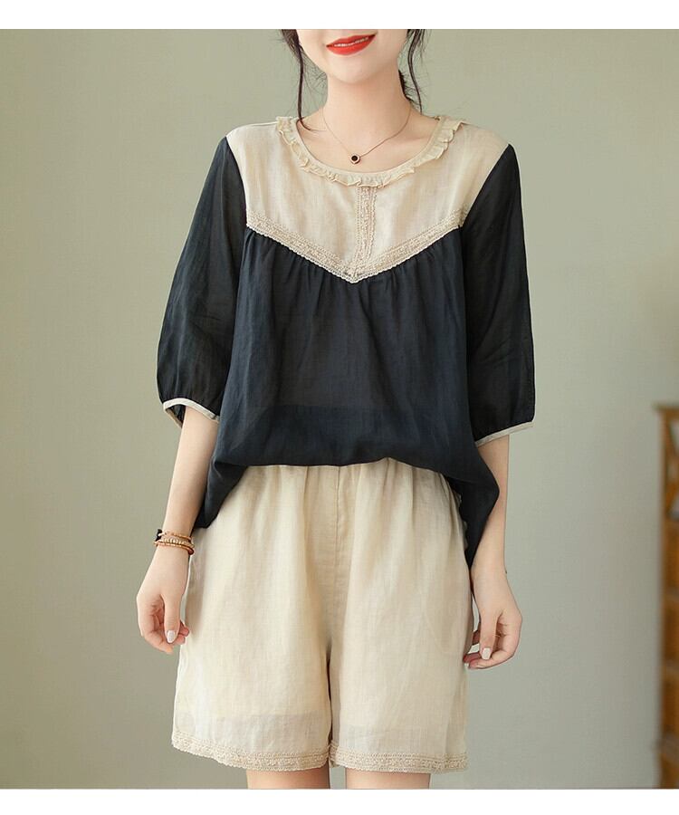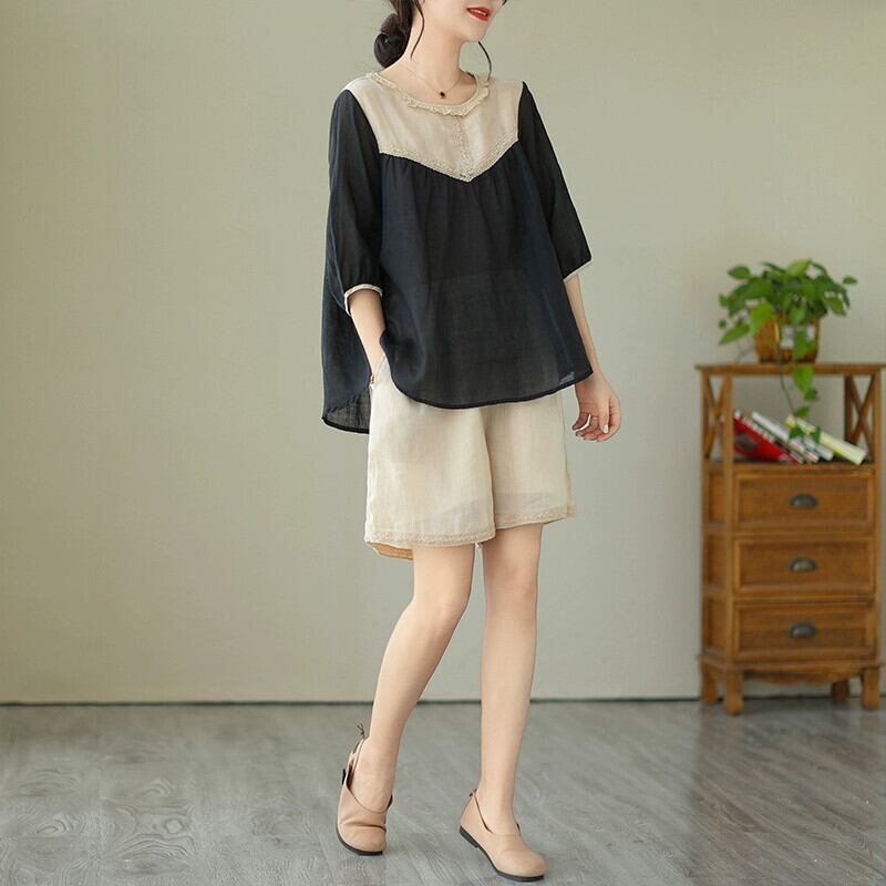Eign Trade 割引ブランドテールグッズ夏の綿とリネンのスーツの女性のライトトップ Tシャツカジュアルワイドレッグショーツ 2 点セット コットン サマー 夏物 ブルマー sine96794994009