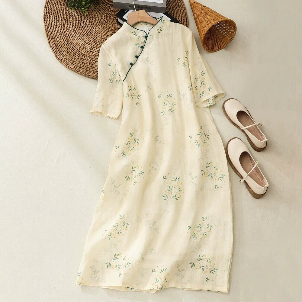 リークを拾いましょう〜カウンターは有名な中国風の改良された綿と麻のチャイナドレスで、気質とプリントされた国民風のバックルリネンドレスです ロング コットン sine87330383479