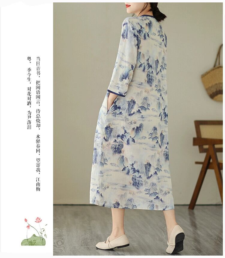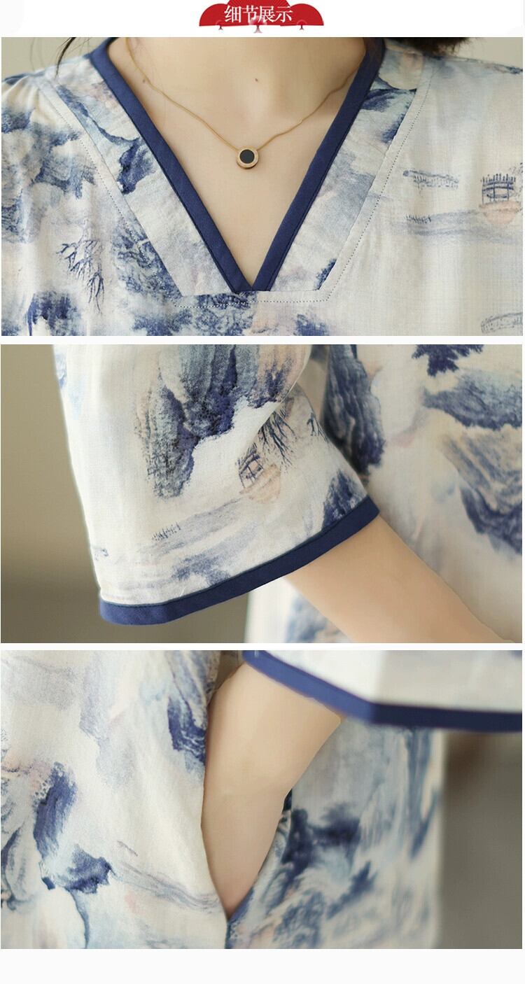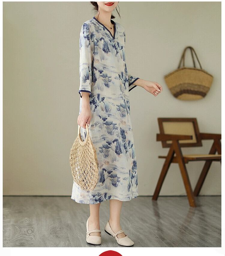 Eign Trade 輸出ブランドテールグッズ中国風インクプリント半袖ドレスレディースルーズ V ネックリネン A ラインミドル丈スカート Vネック Aライン sine10053268256