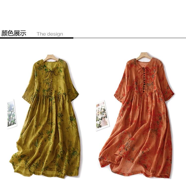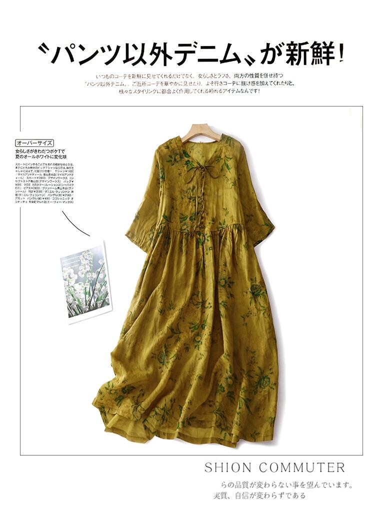eign trade 割引ブランドテールグッズレディースレトロプリントコットンリネンドレスルーズ V ネックレースアップラミー A ラインミドル丈スカート Vネック Aライン sine74479165122