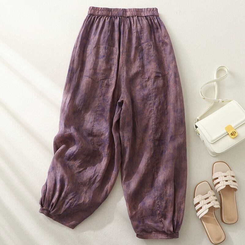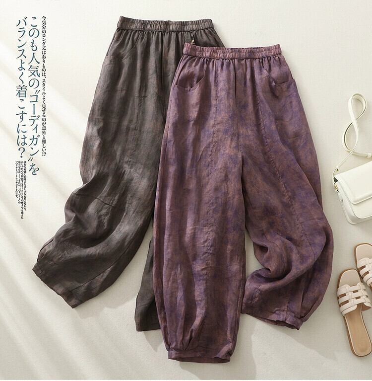 ディスカウントストアショッピングモール撤退レトロ絞り染めコットンとリネンブルマーレディースカジュアルハイウエストリネン9点ハーレムパンツ ショーツ sine65840610352