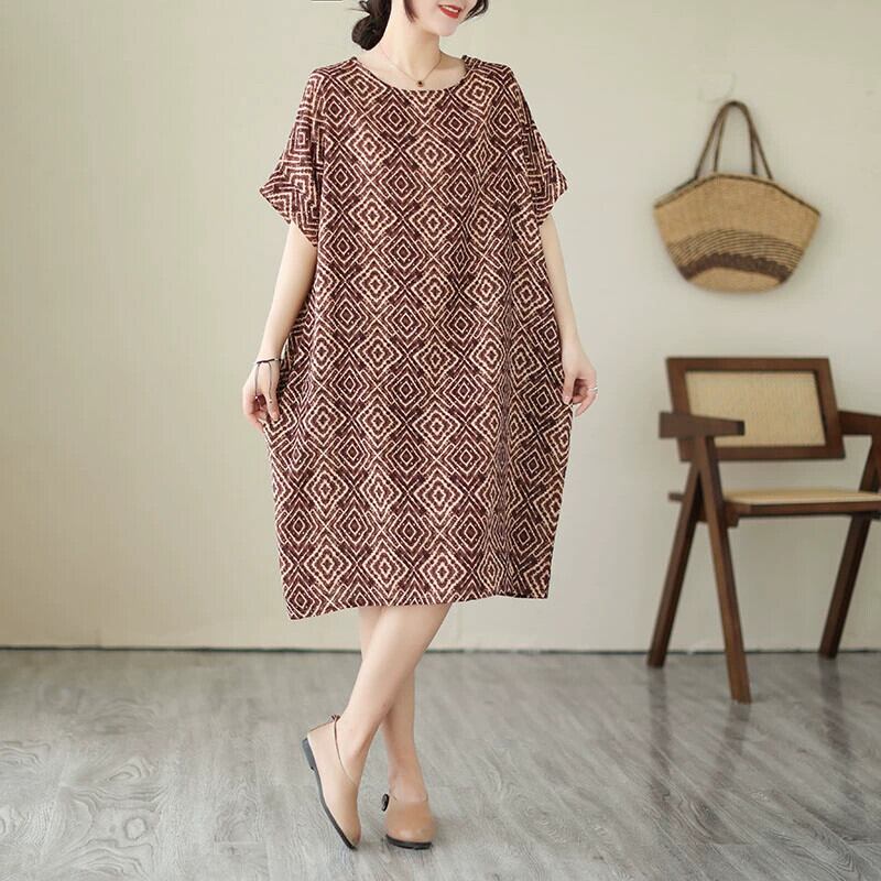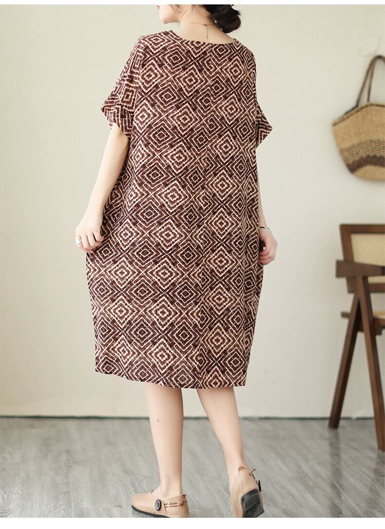 クリアランスカウンター最後の在庫リネンプリント半袖ドレス女性ルーズスリミングコットンとリネンのミドル丈スカート sine55343965894