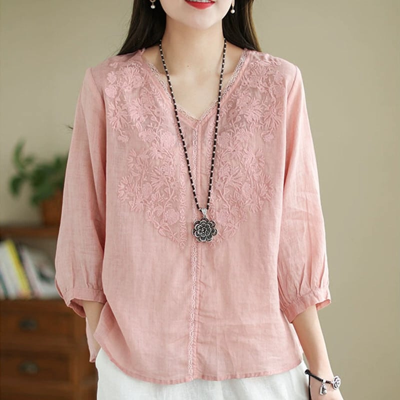 カウンタークリアランスグッズレトロ刺繍ラミーシャツレディースルーズコットンとリネンVネックシャツトップ薄手 レッド sine2675051382