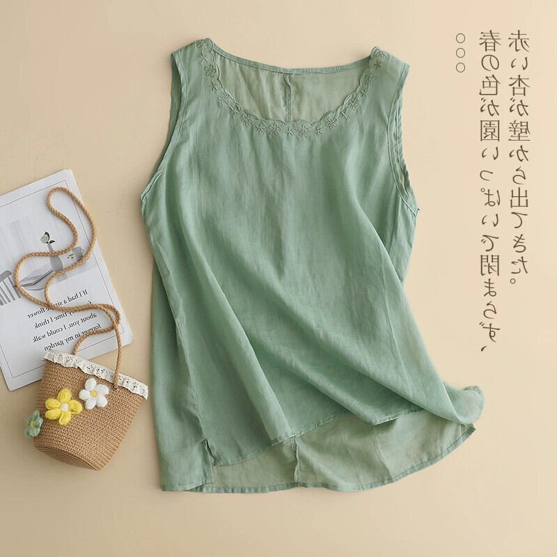 クリアランスリーク〜レトロな刺繍が施されたラミーキャミソールの女性用、ゆったりとした軽いリネントップ付き レッド sine58649790893