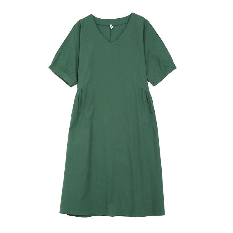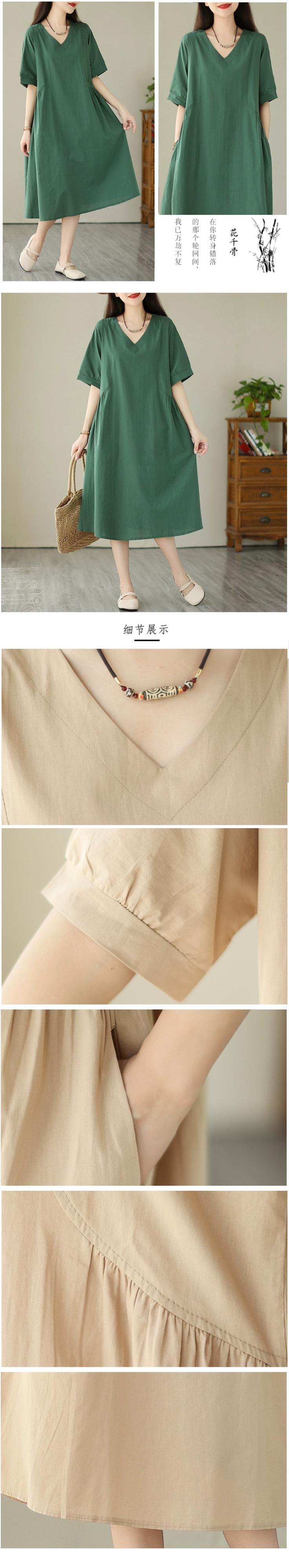 クリアランスカウンター最後の在庫の女性の芸術的なコットンとリネンの V ネックドレス、ルーズでスリムなリネン A ラインのミドル丈スカート Vネック Aライン sine66866333445