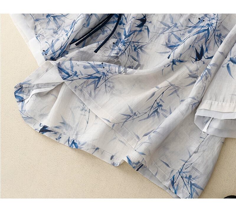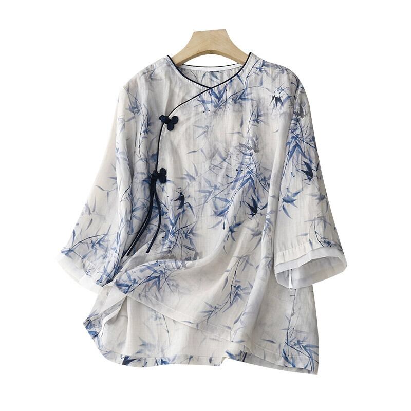 クリアランスカウンター最後の在庫中国風斜めプリントシャツ女性のゆったりとした軽いコットンとリネンの半袖トップ sine43822531585