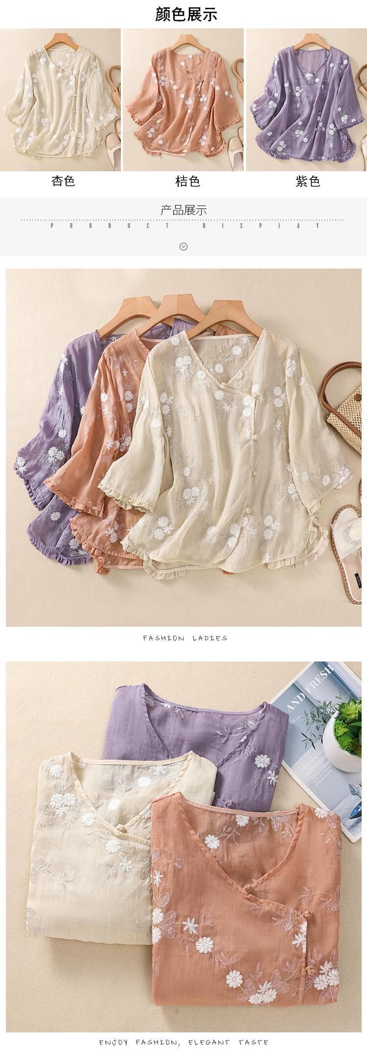 Eign Trade Counter ブランド テール グッズ レトロ斜め刺繍ラミー シャツ レディース 夏 ルーズ コットンとリネン 7 分袖トップ レッド サマー 夏物 sine59664187958