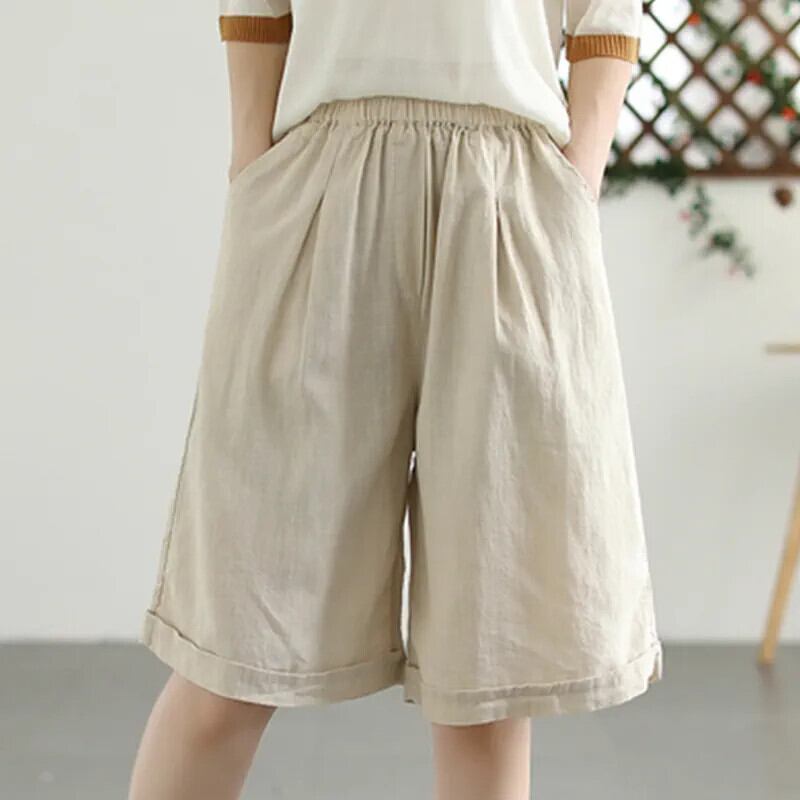 クリアランスリーク〜eseオリジナルシングルリネン5点カジュアルミッドパンツレディース伸縮性ウエストストレートコットンとリネンAラインワイドレッグショーツ エラスティック ブルマー sine92967472377