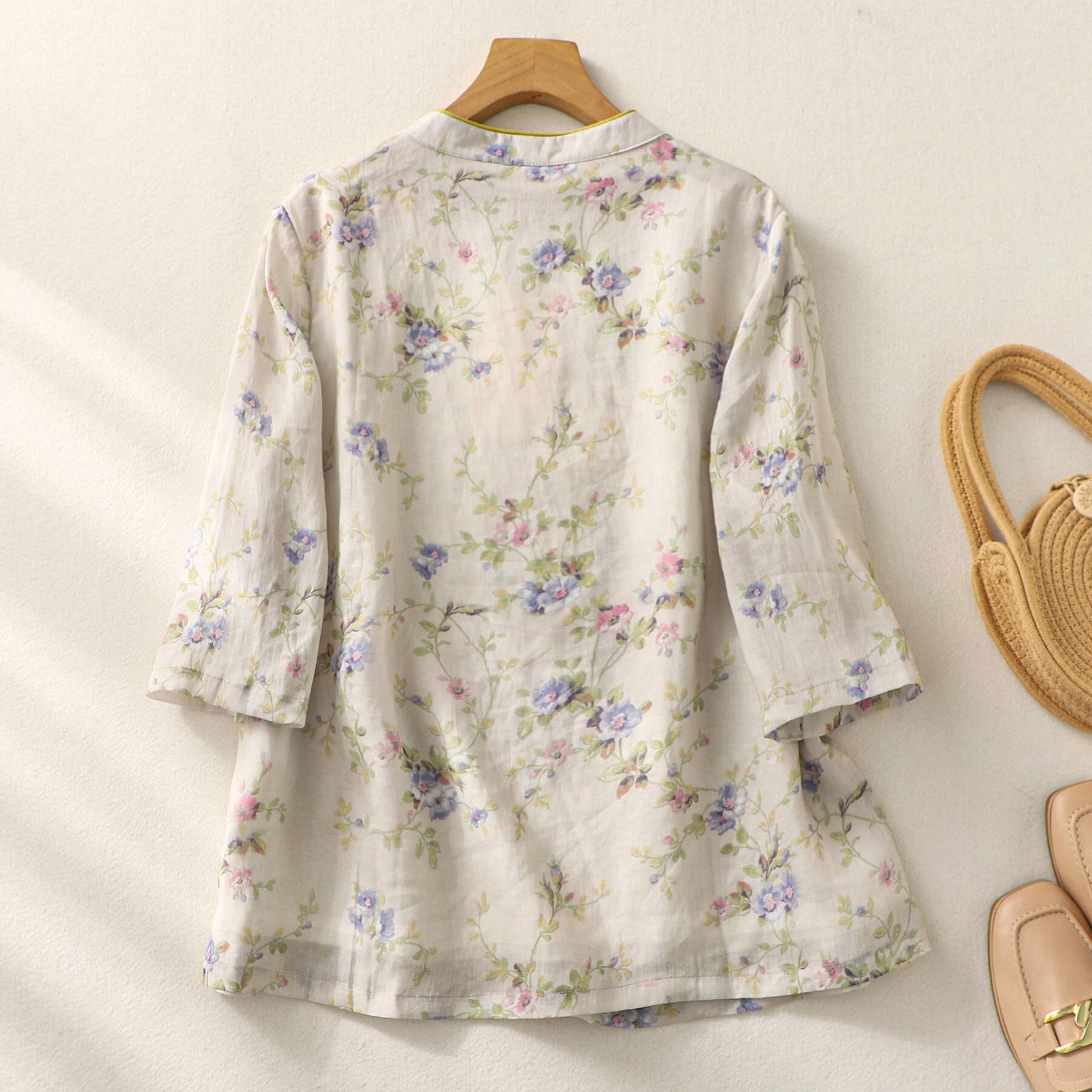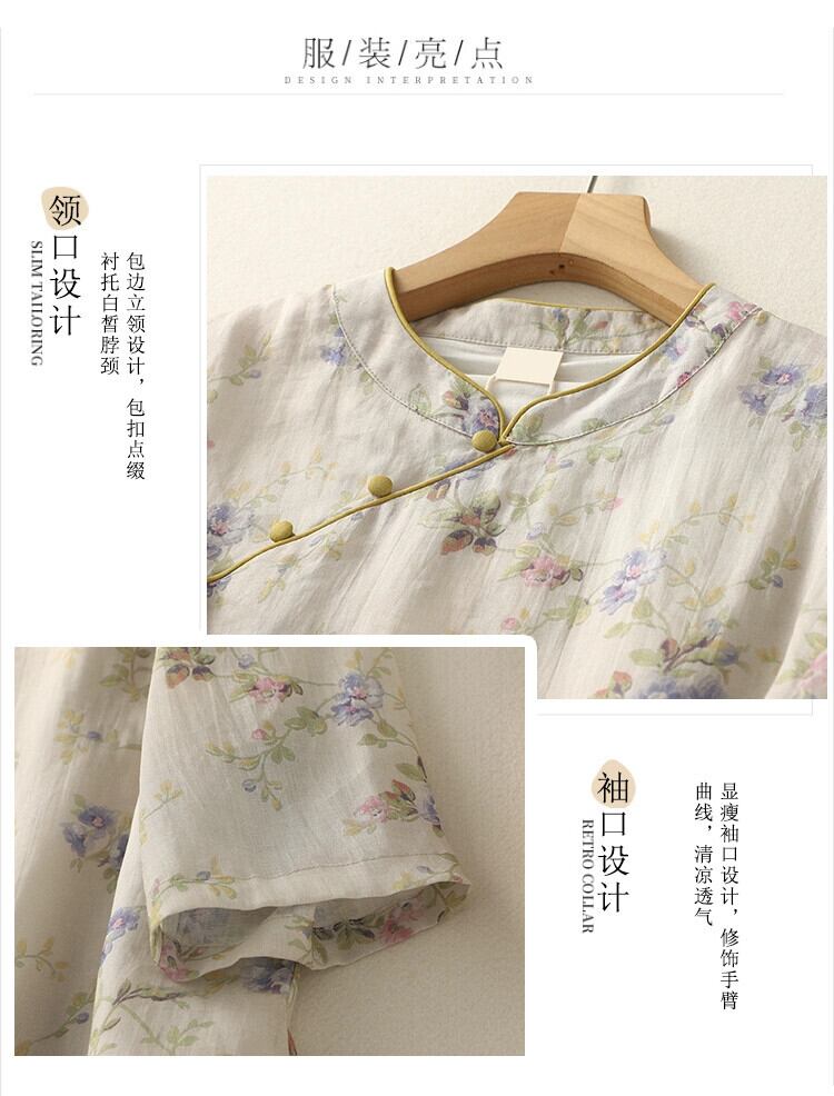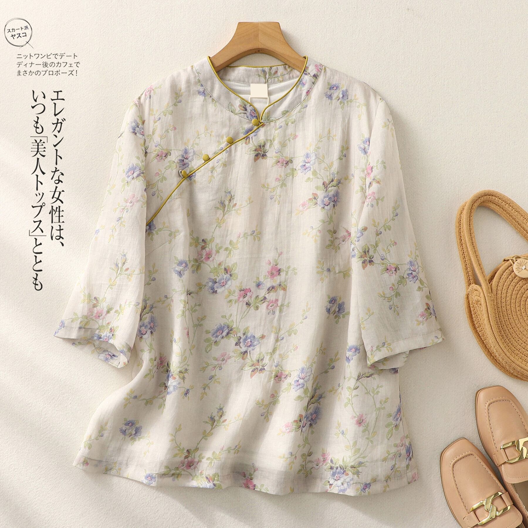 クリアランスリーク〜既製の中国風ラミースタンドカラーシャツレディース、ゆったりとした軽いリネン半袖トップ sine92123191625