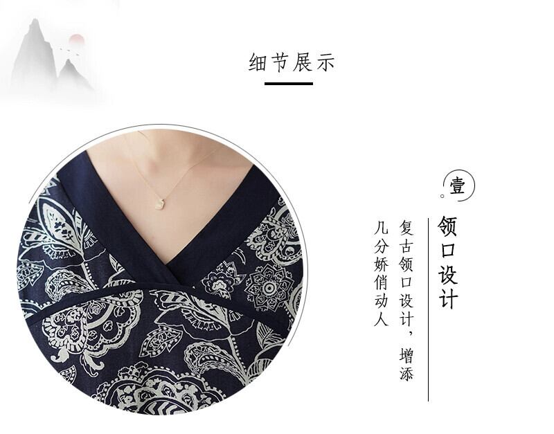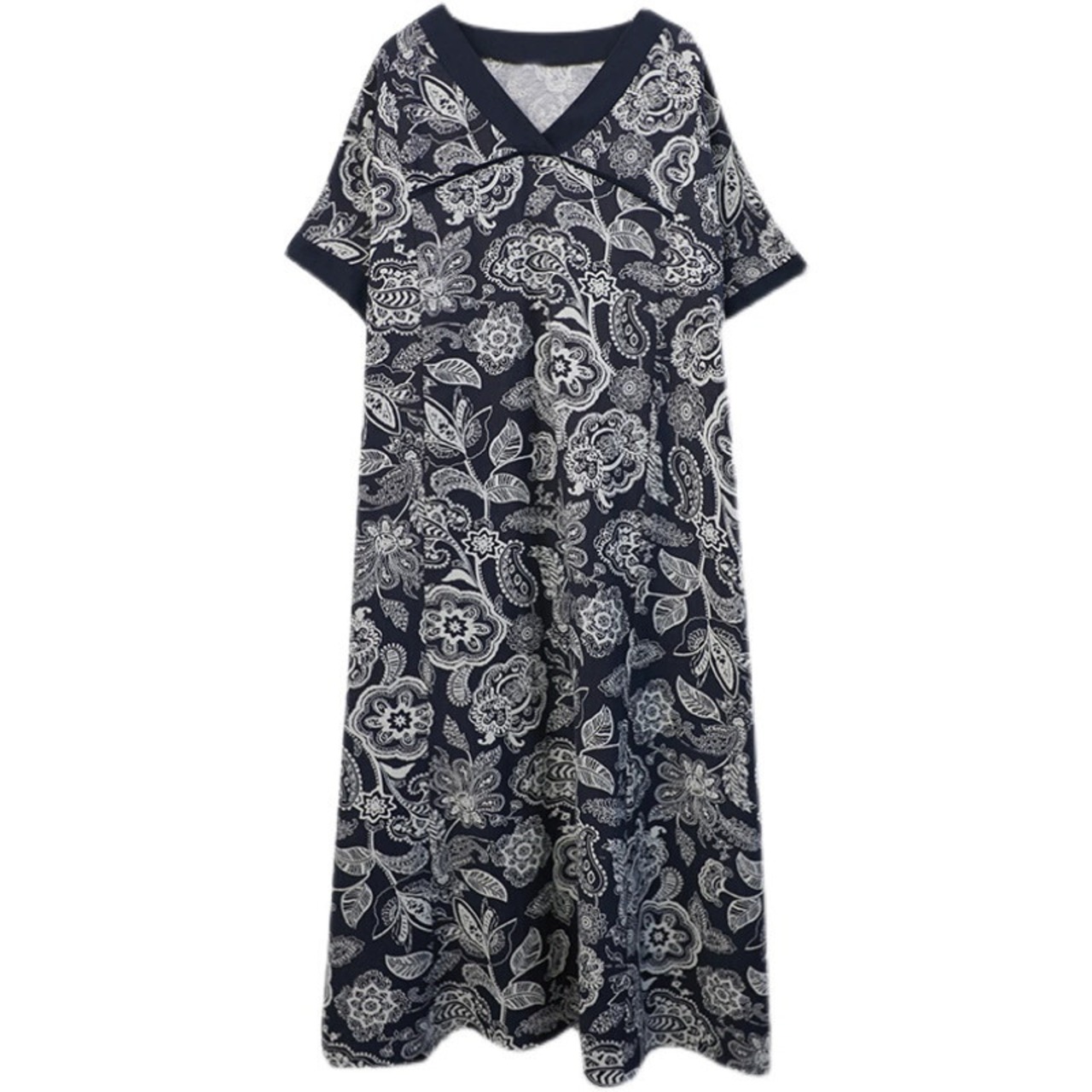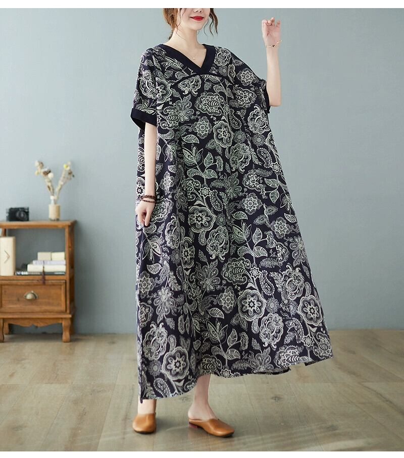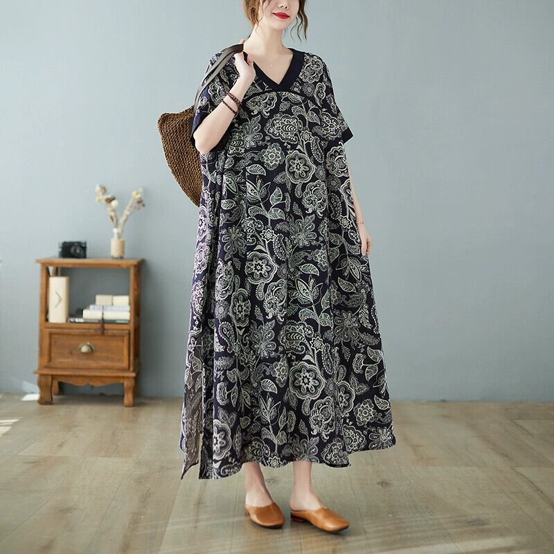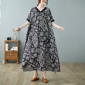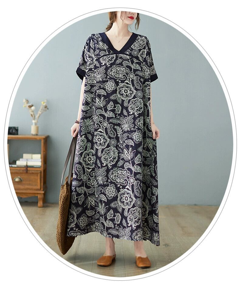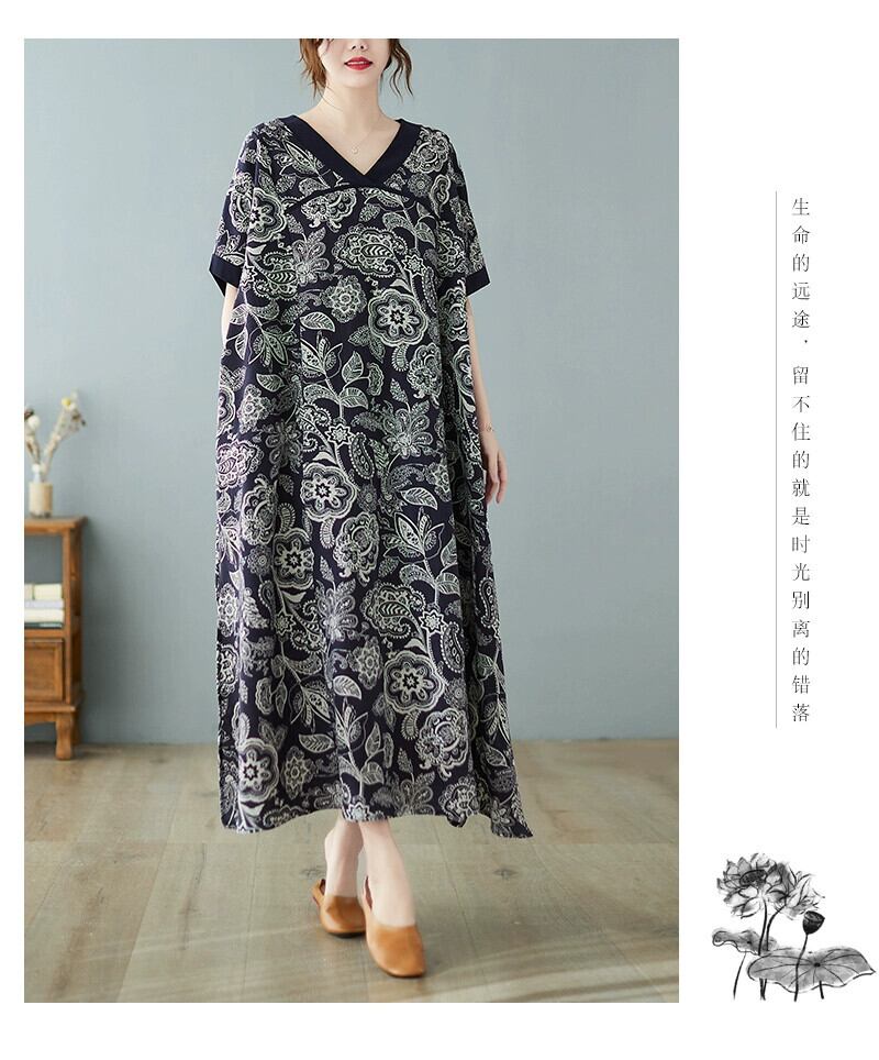 ディスカウント ストア ショッピング モール レトロなコットンとリネンの半袖ドレス、芸術的なプリントのルーズ V ネック リネン ロング スカート Vネック sine20997142704