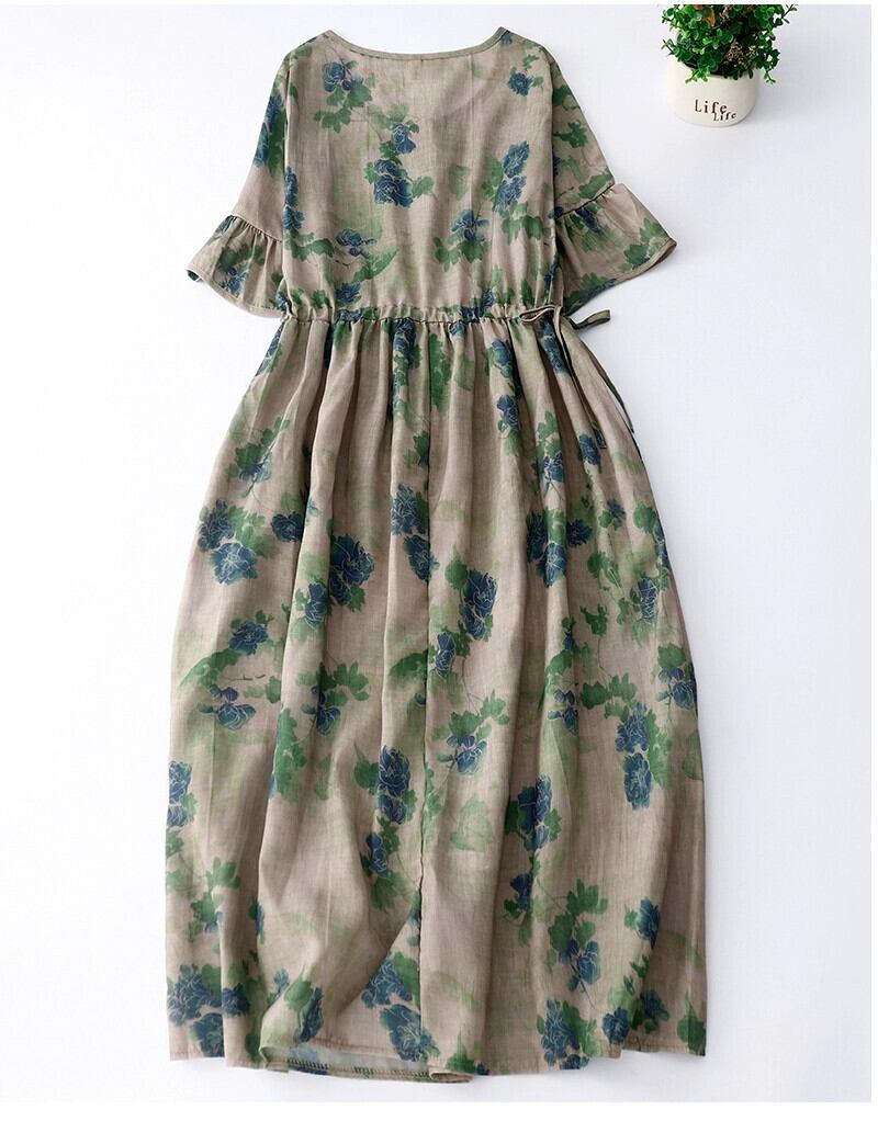 漏れを拾ってください!有名製品のカウンター削除、芸術的なレトロな花柄のコットンとリネンのウエストを細くするリネン半袖ドレス sine63351714909