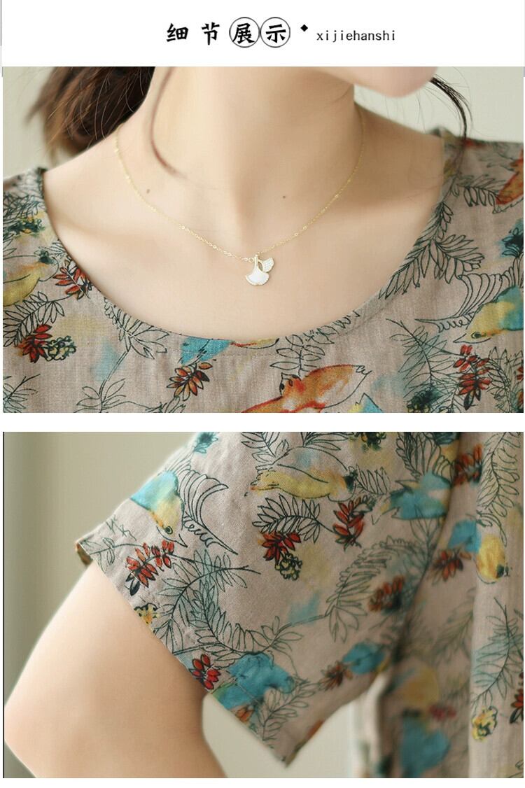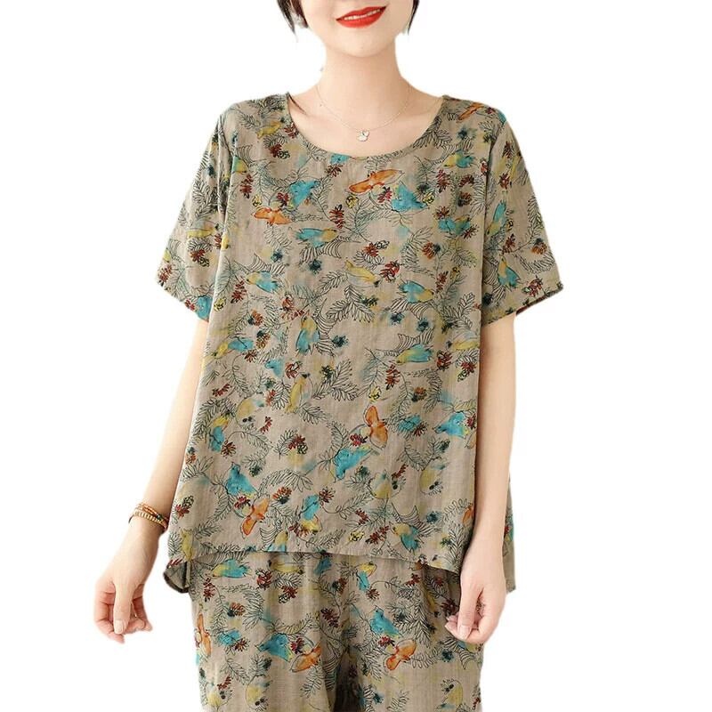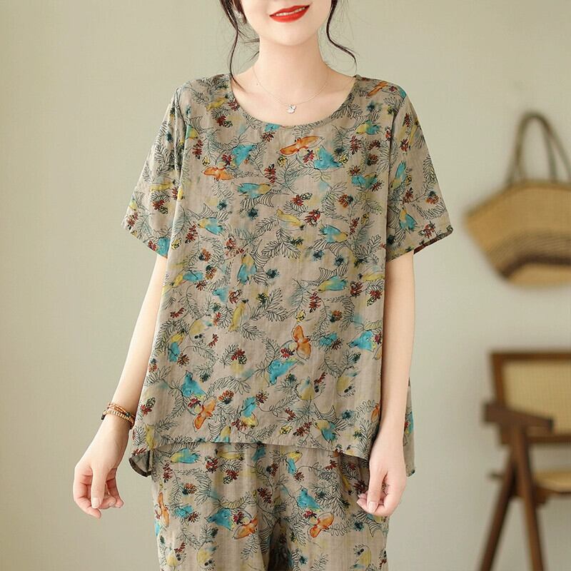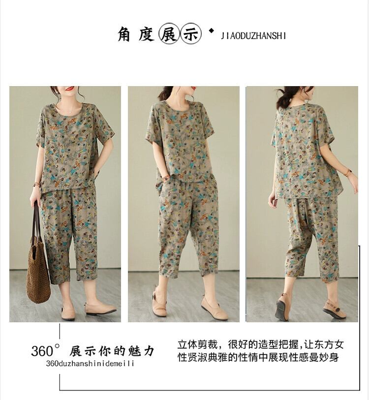 eign trade 割引ブランドテールグッズ綿とリネン花柄スーツレディース半袖 T シャツトップクロップドパンツリネンツーピース夏セット コットン サマー 夏物 Tシャツ sine28148145905