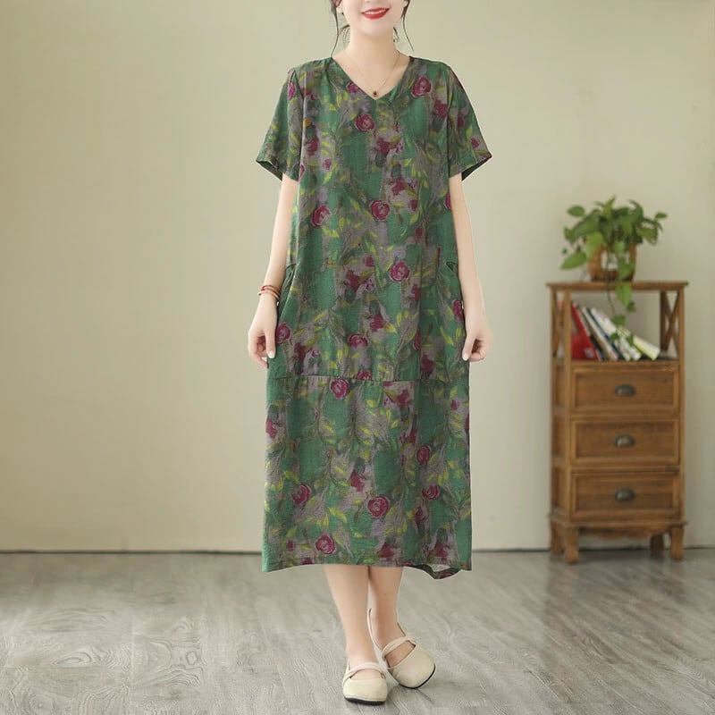 クリアランス漏れ〜有名カウンターからのレトロなプリントのコットンとリネンのドレス、ゆったりとした大きいサイズのVネックリネンのミモレ丈スカート 大きめサイズ sine76833975839