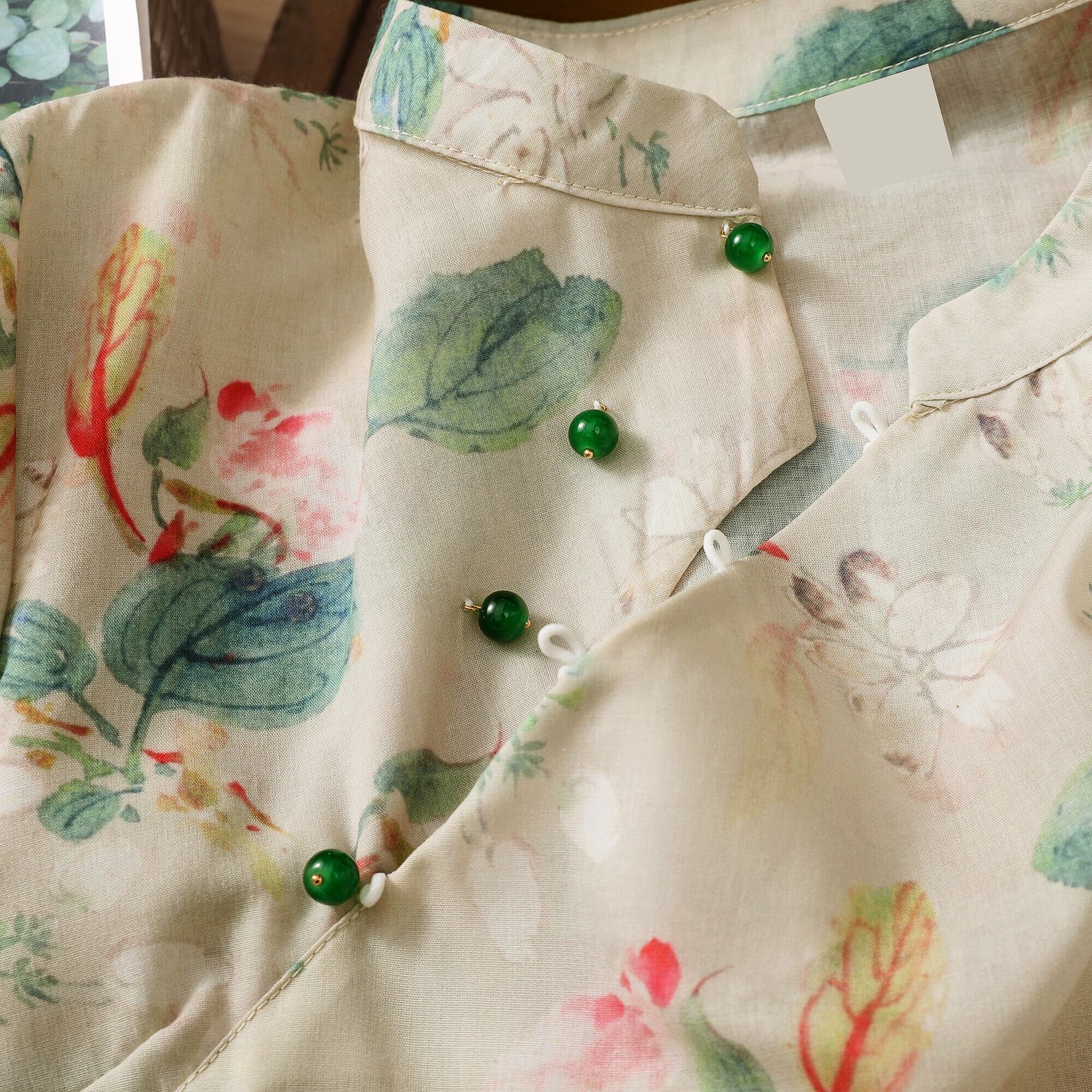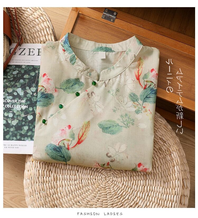 クリアランス漏れ〜カウンター最後の在庫中国風改良ラミーチャイナトップ女性ルーズプリント斜め前立てリネンシャツ sine45075181044