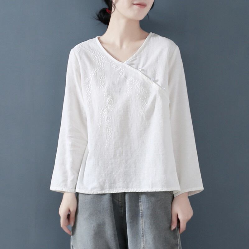 クリアランス漏れ〜カウンター最終在庫レディース中国 V ネック斜め前立てリネン T シャツトップルーズ長袖コットンとリネンのシャツ秋 ロング オータム 秋物 Vネック Tシャツ sine64976593346