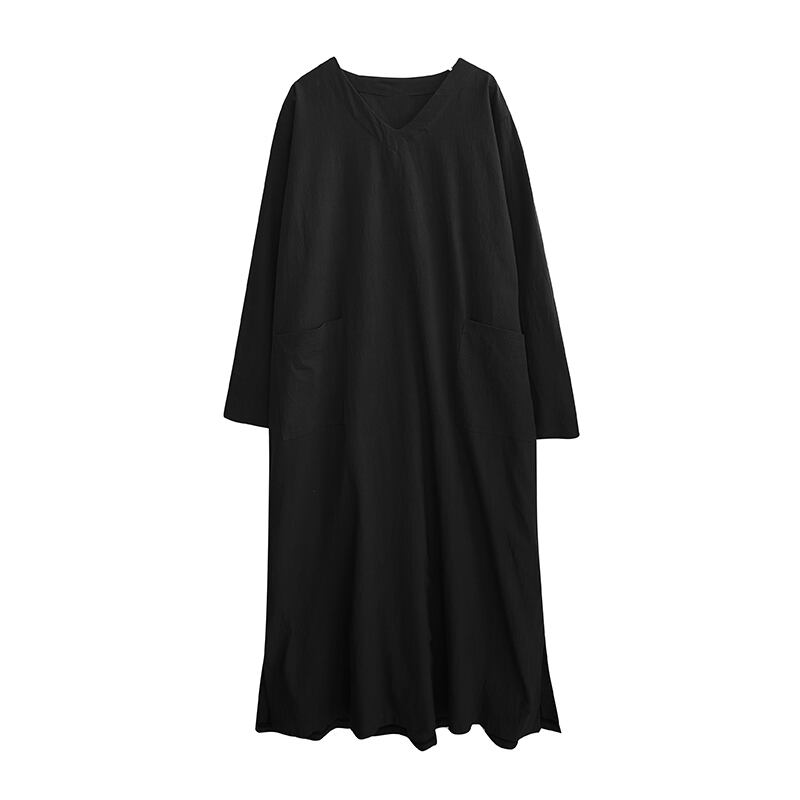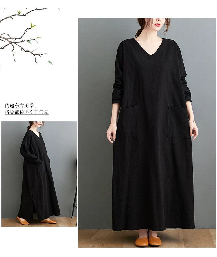 特大サイズ 220 ポンドの女性用長袖ドレス、春と秋、ゆったりとした老化防止 V ネック、脂肪と肉をカバーする綿と麻のロングローブ コットン 大きめサイズ スプリング 春物 オータム 秋物 Vネック sine52826077188