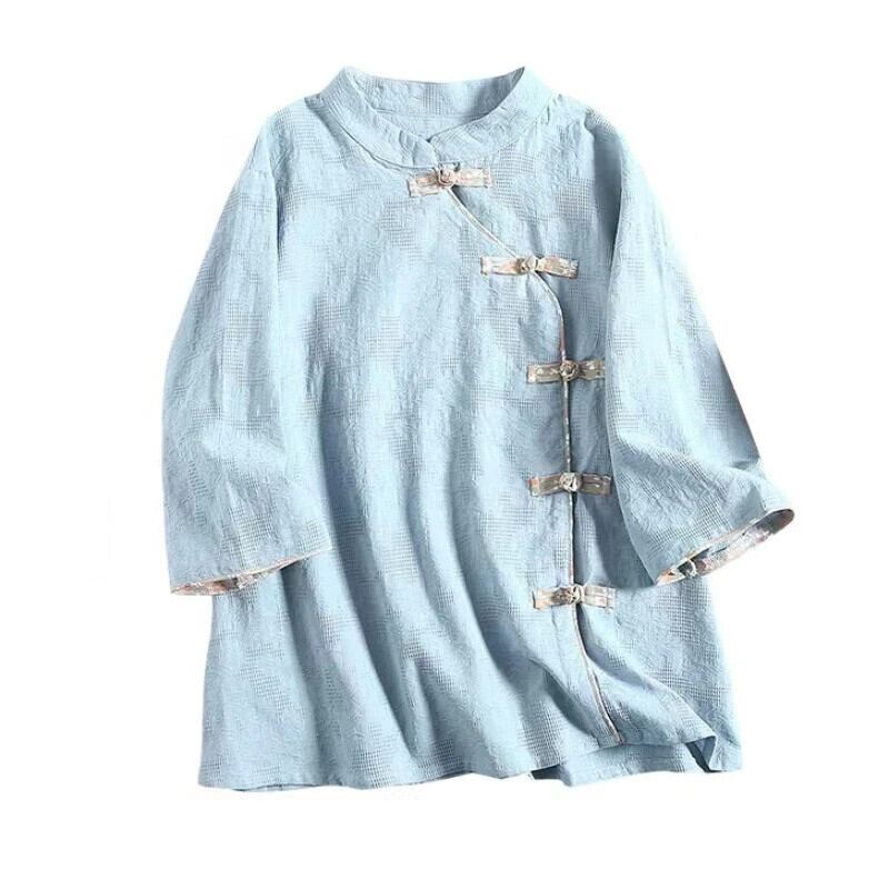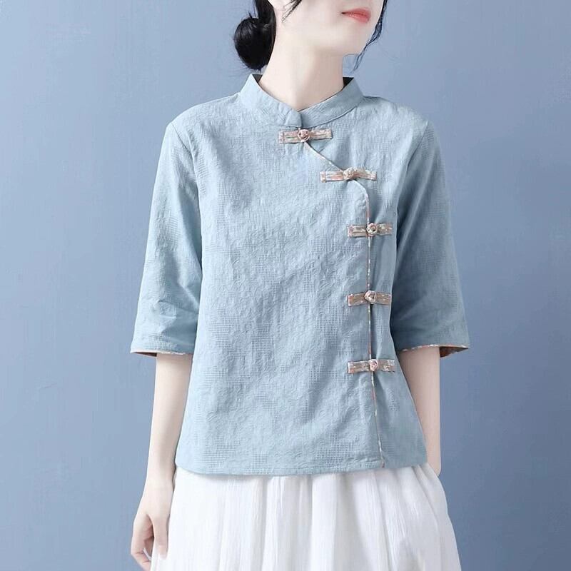 カットラベルショッピングモール除去レディース綿麻半袖シャツカジュアルチャイナプレートボタンスタンドカラーリネン薄手トップス コットン sine68502905801