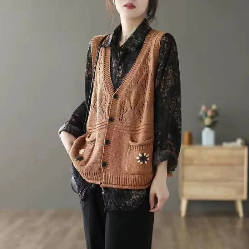 ese and eign 貿易クリアランス女性のカジュアル V ネック中空かぎ針編みセータートップルーズニットセーターベストジャケット Vネック sine85763682976