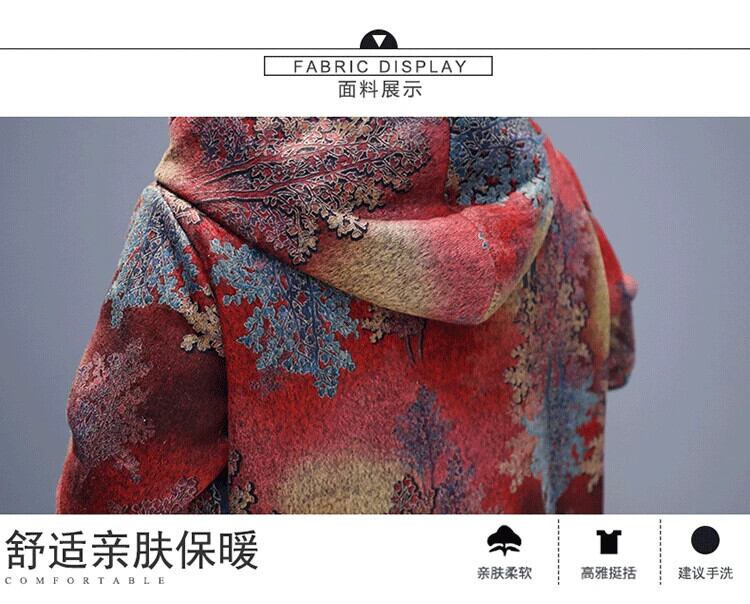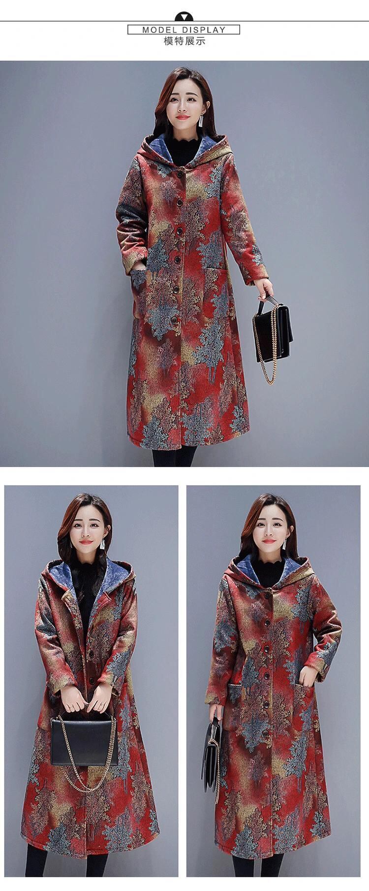 秋冬のエスニックスタイルのフード付き膝上ウィンドブレーカーレディース、ゆったりとした大きいサイズとベルベットと厚みのあるパターン、ミドル丈のマザーズジャケット 大きめサイズ オータム 秋物 ウィンター 冬物 sine2846869060