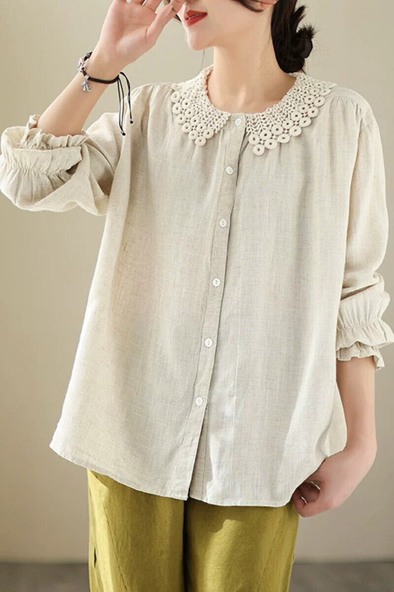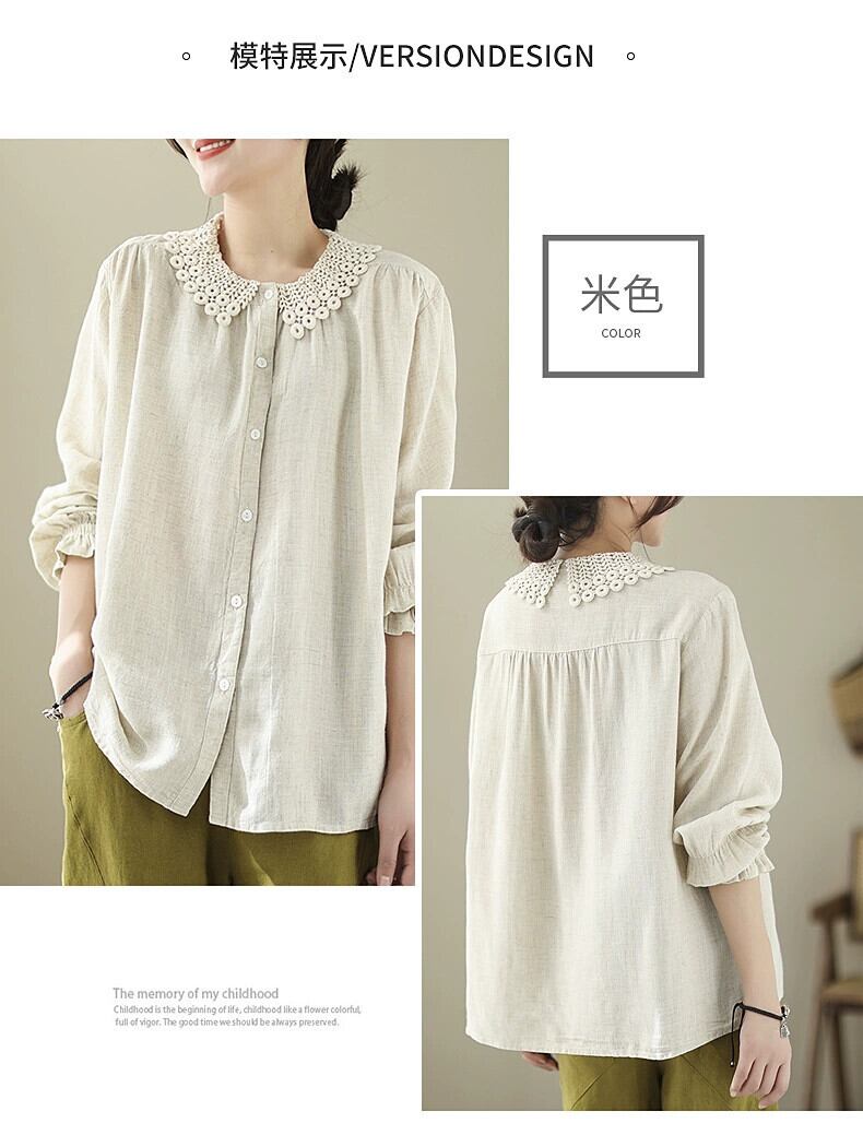 Eign Trade Export Big-Name Tail Goods レディースクリアランスレトロ中空ソリッドカラーカジュアルトップルーズドールカラー長袖シャツ ロング sine51368561997