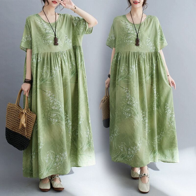 クリアランスクリアランスカウンター牛グッズ撤去レディース綿麻プリント半袖ワンピースアーティスティックゆったり大きいサイズAラインロングスカート コットン 大きめサイズ sine10232635832