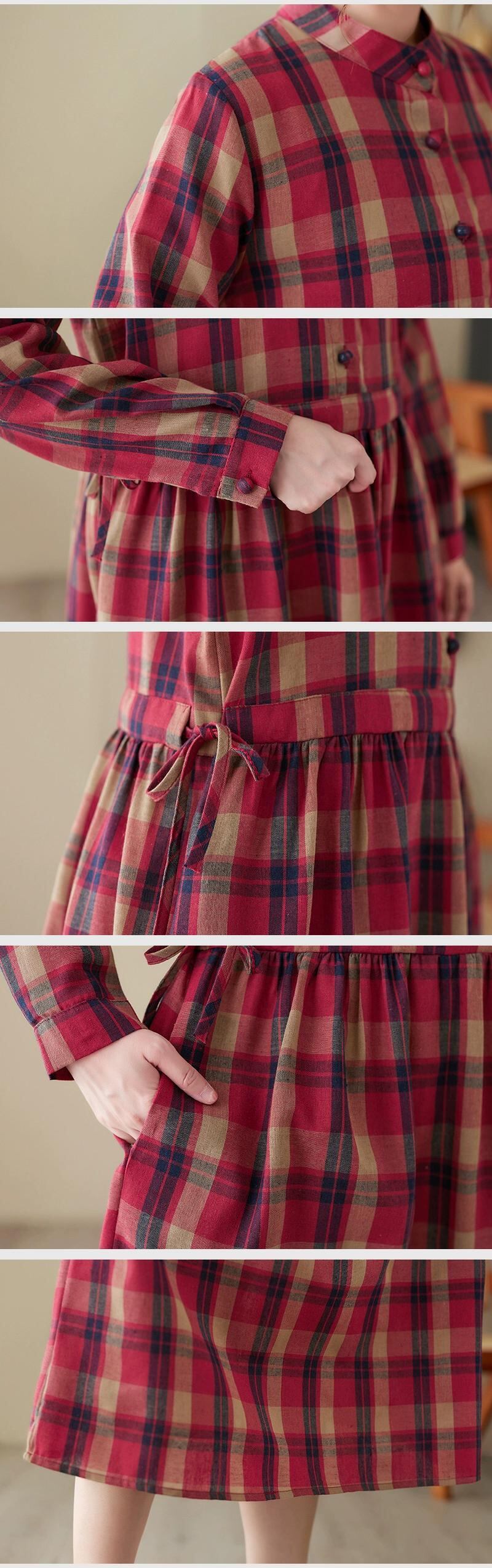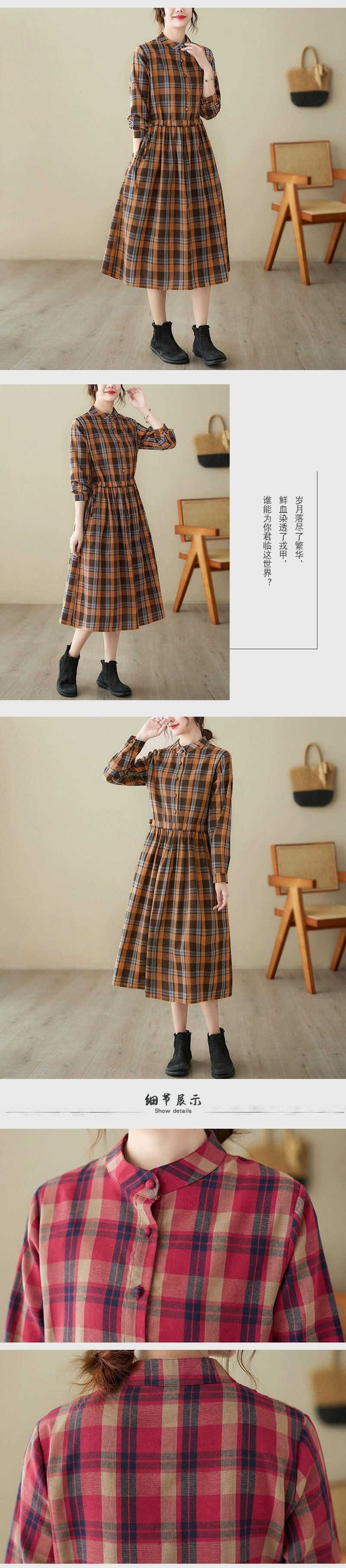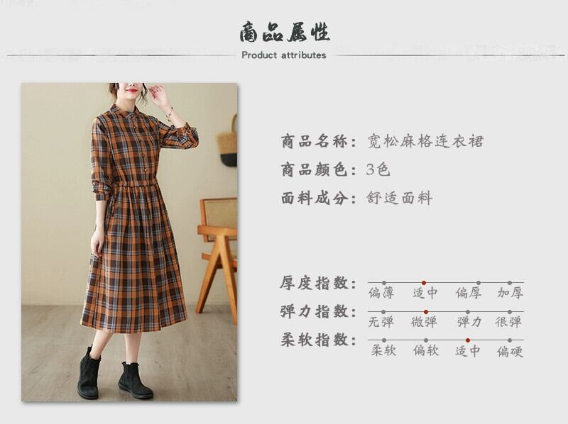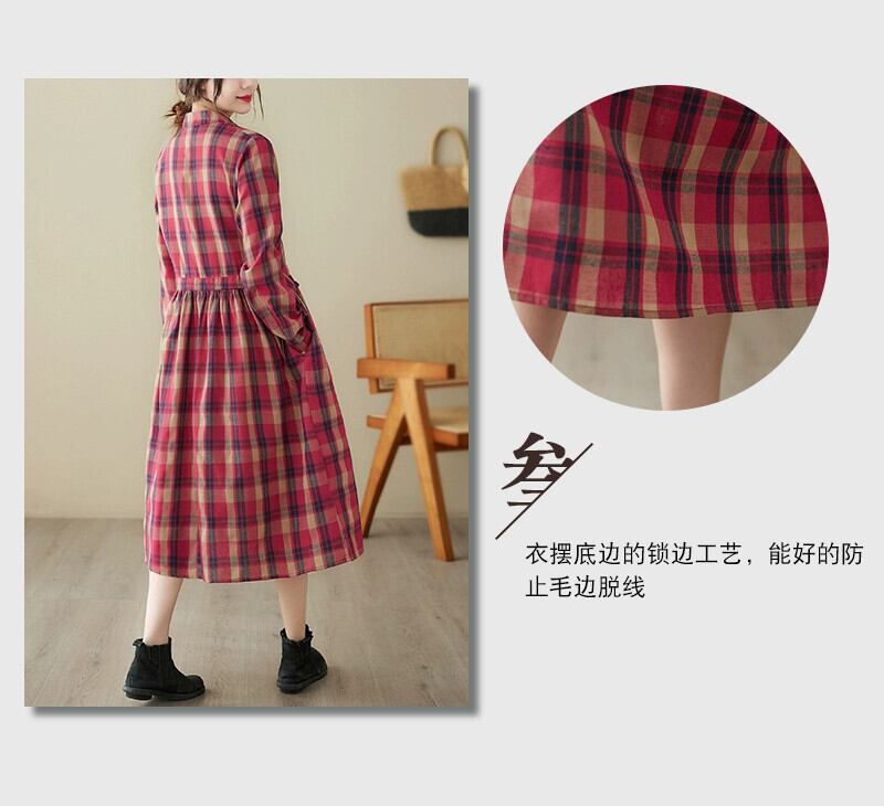 eign trade 割引ブランドテールグッズ女性の文学チェック柄リネンシャツスカートルーズ痩身長袖コットンとリネンのドレス ロング sine72644533297