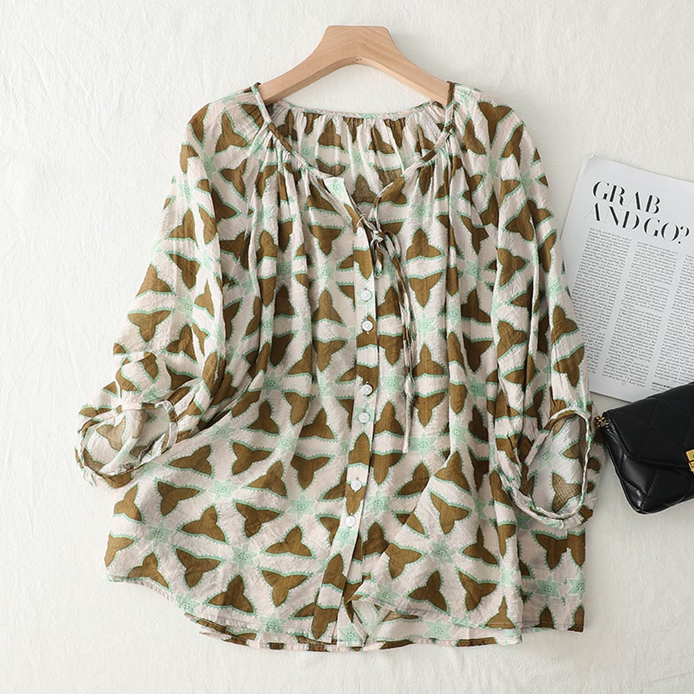 and South eign trade ビッグブランドテールグッズクリアランスルーズプリントコットンとリネンシャツトップレディースネクタイ V ネックリネンシャツ夏 サマー 夏物 Vネック sine11844720928