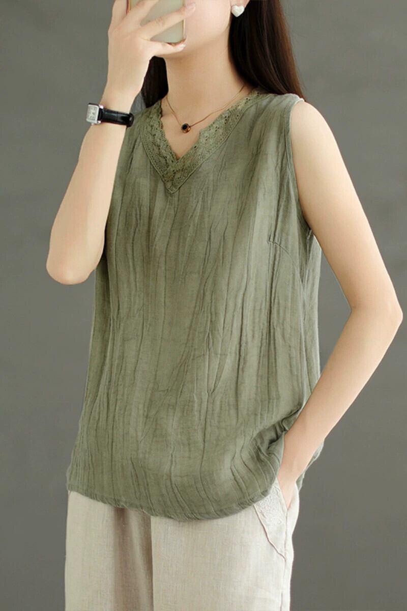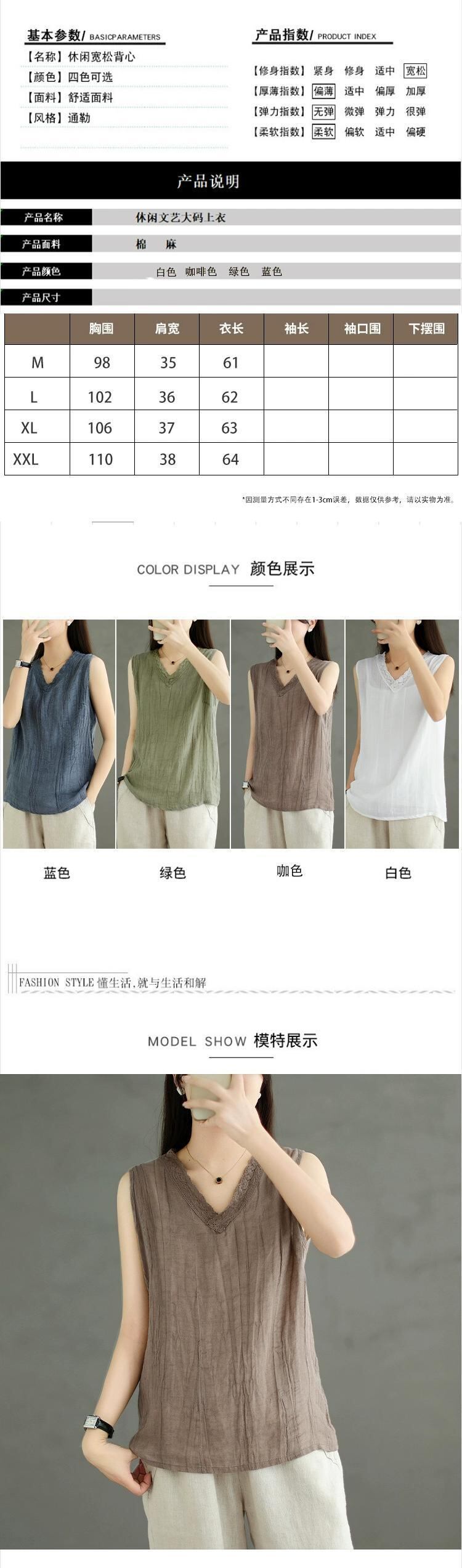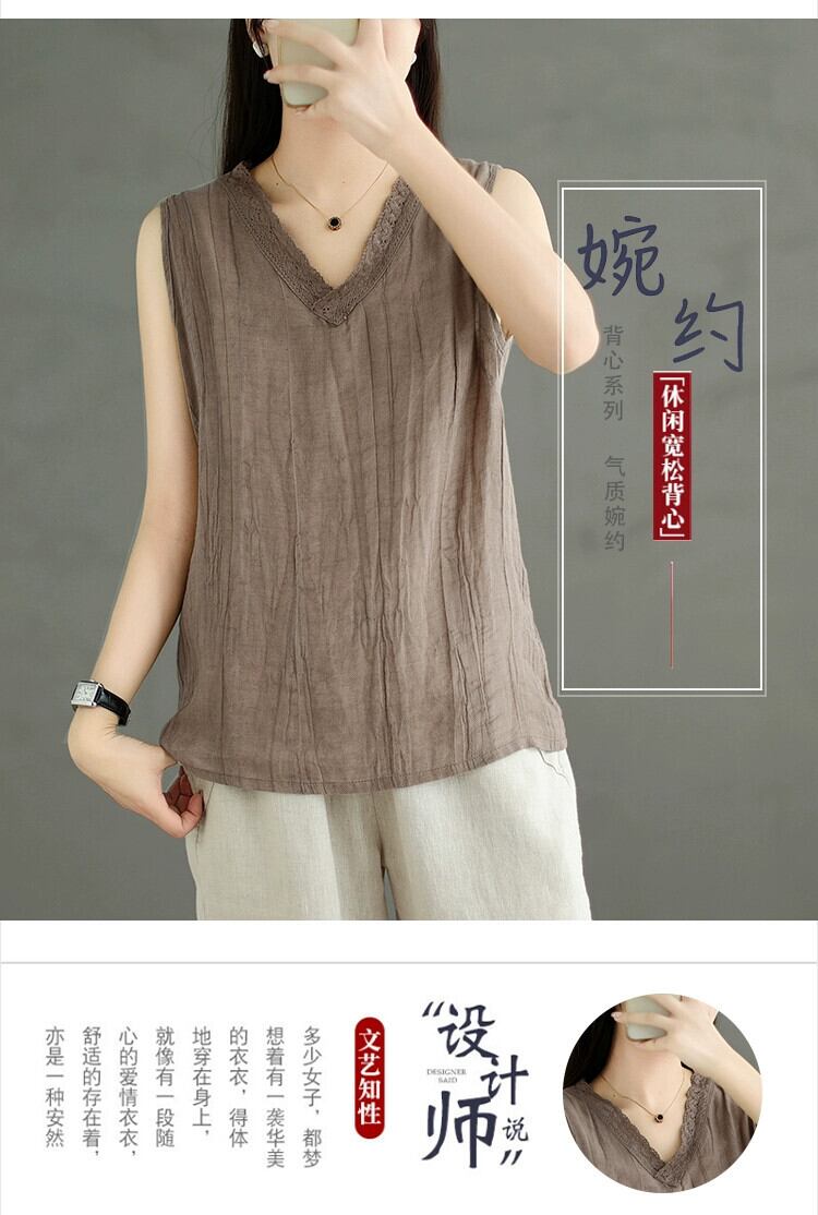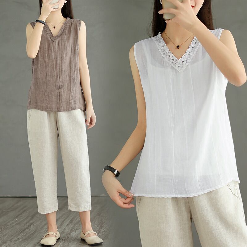 クリアランスブランド 牛グッズ カウンターエンドグッズ レトロ 綿麻 Vネック キャミソール レディース ゆったり リネン ノースリーブ トップス 薄手 コットン sine90734616392