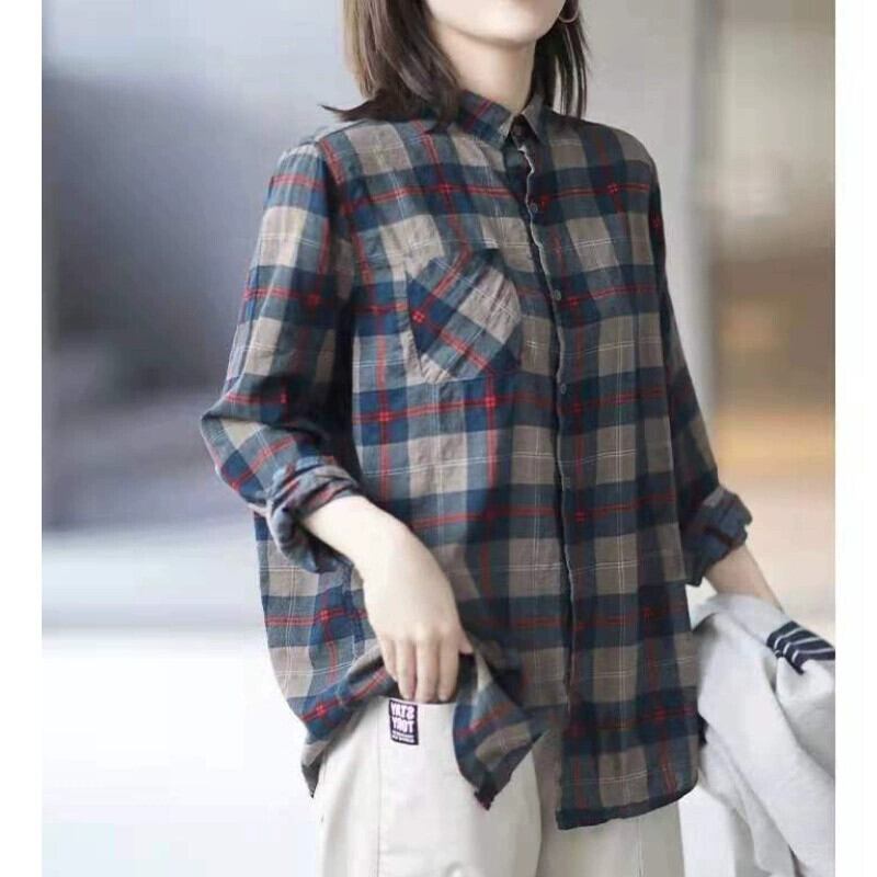 クリアランス漏れ〜カウンタービッグブランド牛レディースレトロチェック柄リネン長袖シャツルーズラペルコットンとリネントップ ロング sine76097847928