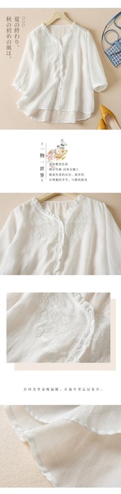 eign trade ese オリジナルハイエンドブランドの女性の刺繍綿とリネン V ネックシャツ夏ルーズリネン半袖シャツトップ レッド コットン サマー 夏物 Vネック sine24342776347