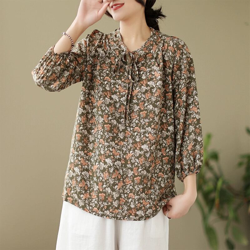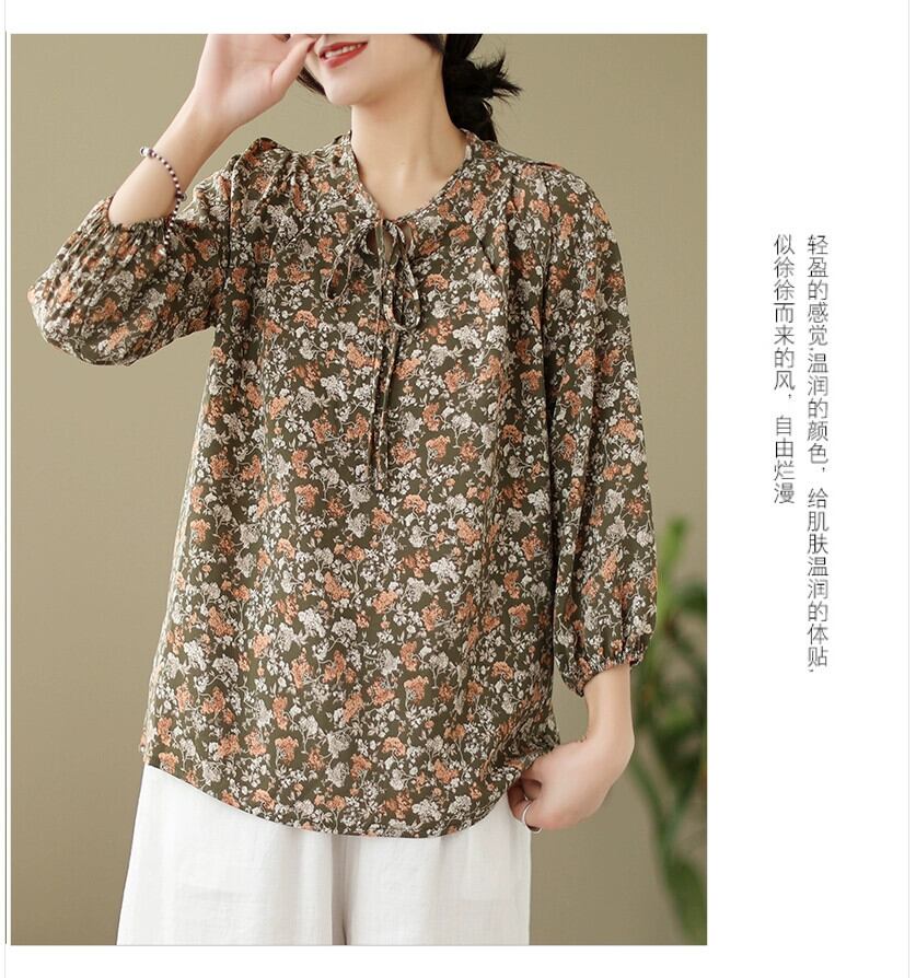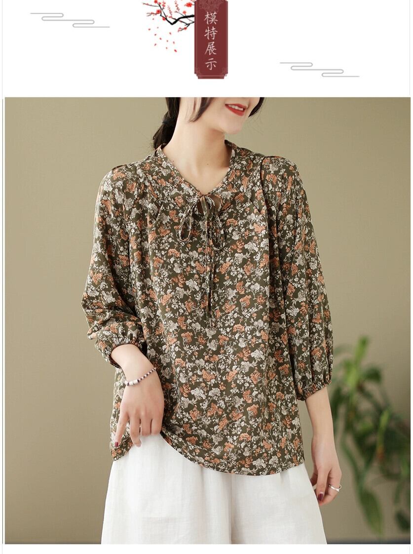 ese オリジナルシングル eign 貿易ビッグネーム女性の文学レトロ花柄七分袖シャツルーズカジュアルレースアップシャツトップ sine41427523414