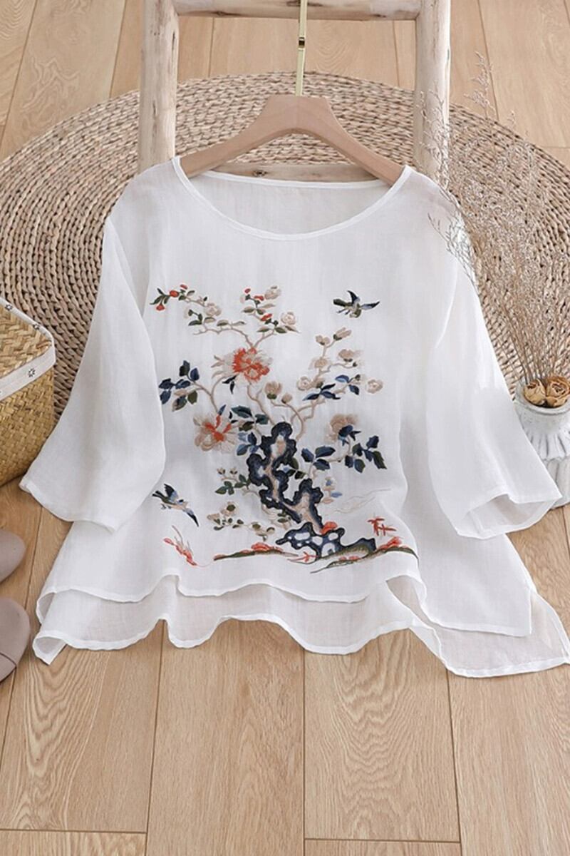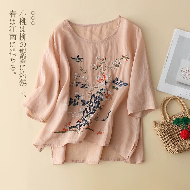 eign trade ese オリジナルシングルビッグネーム撤退レトロ刺繍綿とリネンシャツレディースルーズリネン半袖 Tシャツトップ薄い レッド コットン sine97085396111