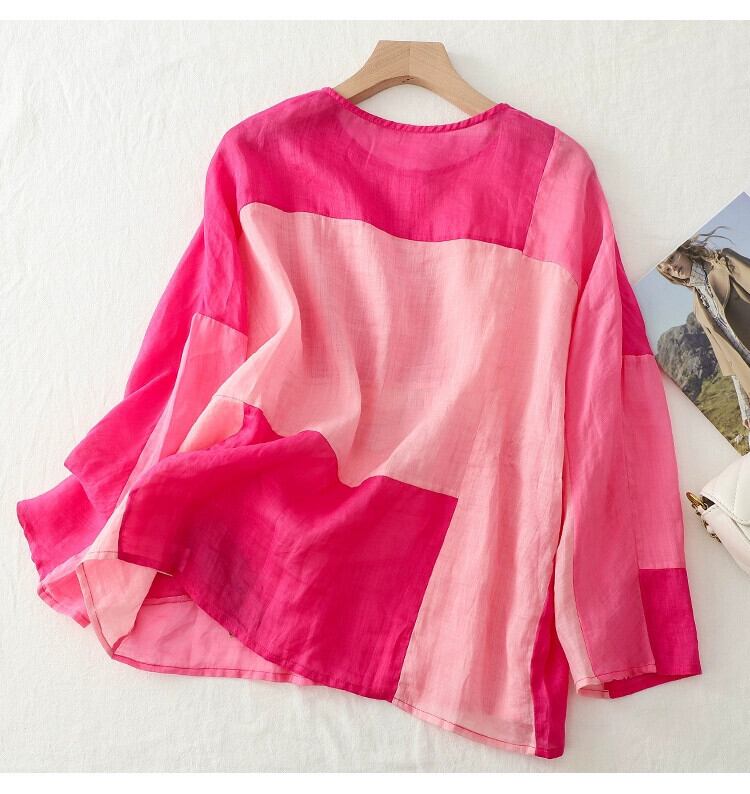 クリアランスリーク〜eseオリジナルの単一の対照的な色のスプライシングコットンとリネンのシャツの女性、ゆったりとした軽いリネンの日焼け止めカーディガントップ sine3026290575
