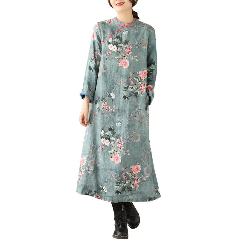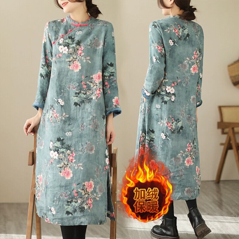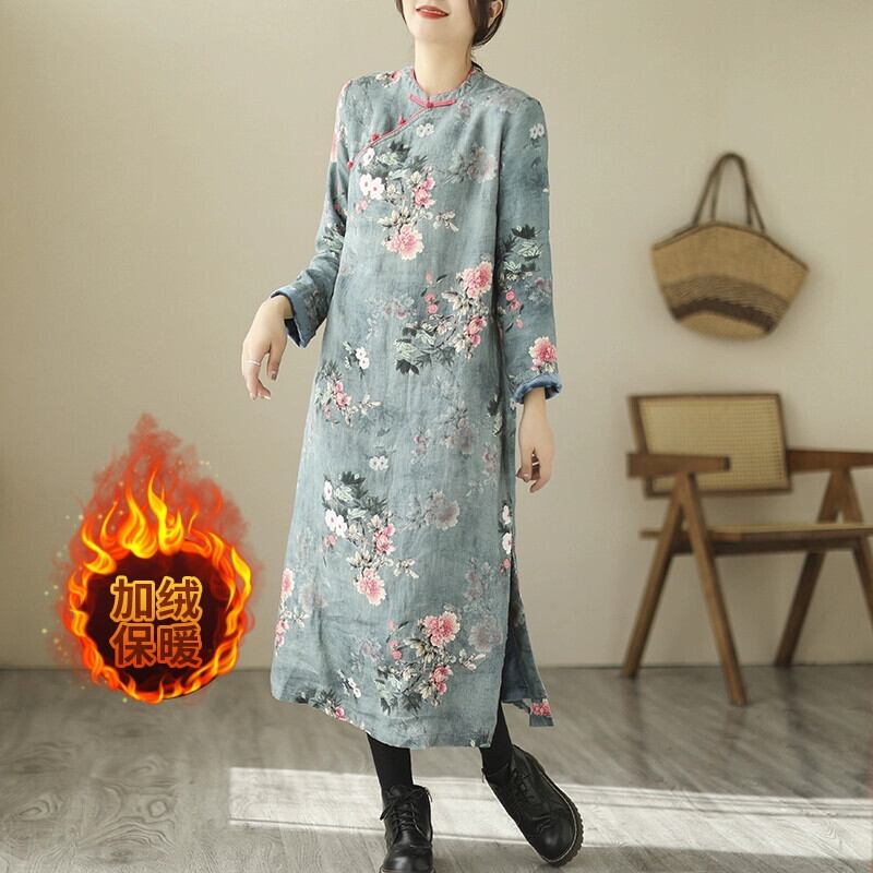 クリアランスカウンター最後の在庫の女性用中国製改良プリントチャイナドレスロングスカートとベルベットと厚みのあるコットンとリネンのドレス sine20181131783