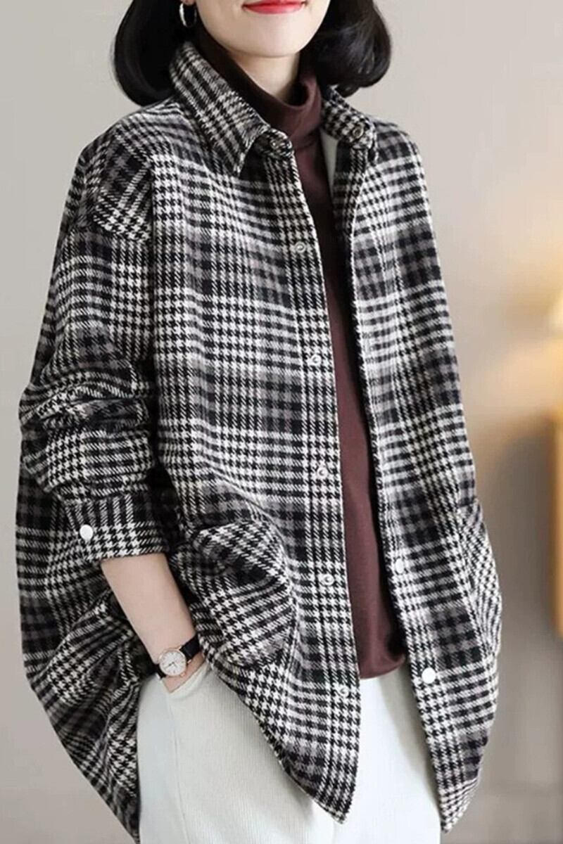 ディスカウントストアの有名カウンター引き出しクリアランスレトロ起毛シャツジャケットレディースルーズ痩身ラペルチェック柄トップ sine39524763566